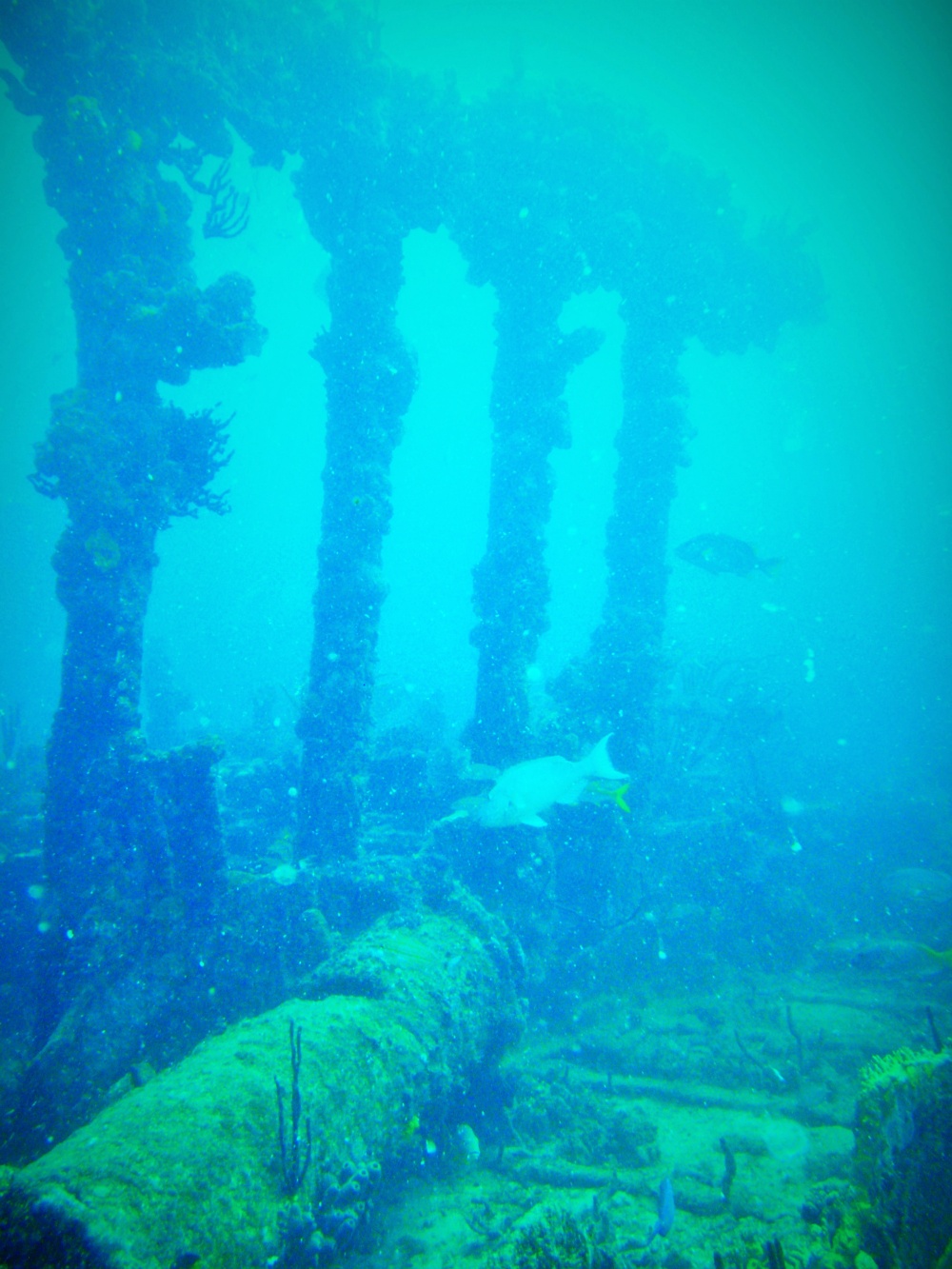 When you reach the stern of the wreck, you will see the propeller and there is a large pole only 25 ft underwater where you can free-dive to inspect small crabs living there. The shaft and gearbox can be seen running into a depth of 70ft where other pieces can be seen on a day with clear water and little current. This is also one of our favorite SCUBA diving sites.