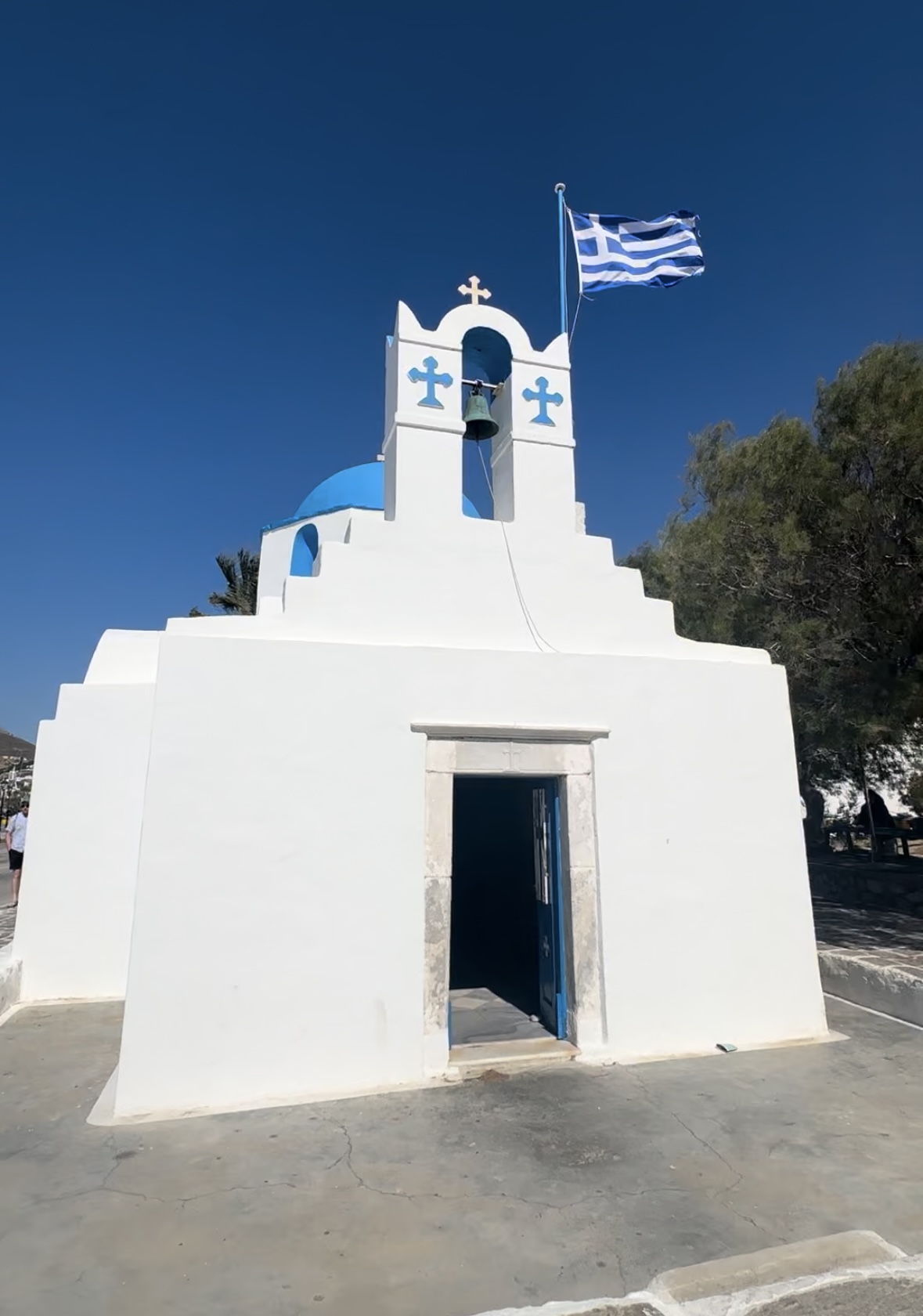 This morning we left Anti Paros and sailed for about an hour over to Paros. We anchored and then took the dingy straight to the town to explore. This was one of my favourite islands. Walking the narrow alley ways we saw traditional blue domed churches, many of which we were able to go inside. Paros has a mix of traditional Cycladic architecture, vivid nightlife and enchanting rural villages. As it was actually Easter Sunday (and we loved our meal last night), we stopped in one of the many restaurants along the promenade for another Easter meal. We had lamb again with a delicious Greek salad and bread. We walked along the beach front and viewed the windmills to burn off some of our lunch calories! We then visited the Panagia Ekatontapiliani Church. It was built in around 326 AD. This is one of the most important and best preserved Christian Churches in Greece. We took the dingy back to the yacht where we saw more Easter fireworks, and to end a great day, an incredible sunset.Â