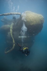 The Kodiak Queen was launched in 1940 as U.S. Navy fuel barge YO-44 and is one of only five ships that survived the Pearl Harbor attack. As the Kodiak Queen, the ship began a new life as a fishing boat. Historian Mike Cochran found the ship rusting in a Road Town junkyard in 2012. He set up a website in an effort to rescue the ship and got some famous attention. Owen Buggy, a friend of and photographer for Sir Richard Branson, saw the site and suggested the ship as an artificial reef.