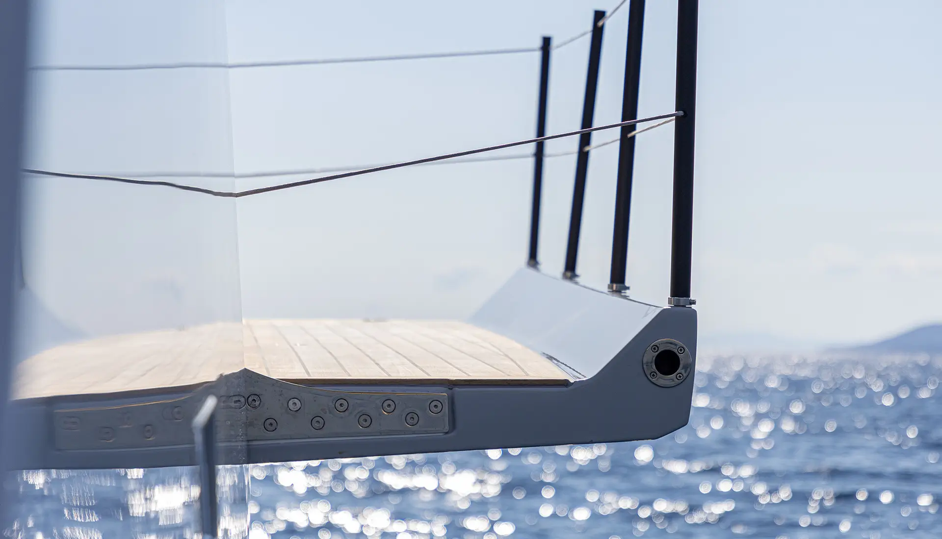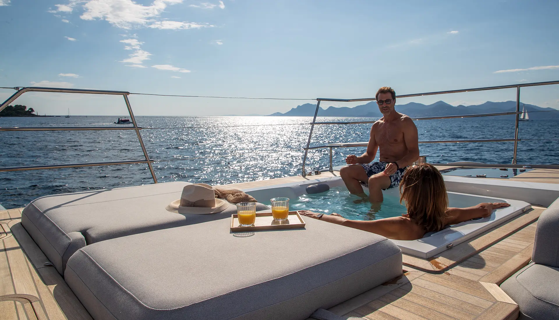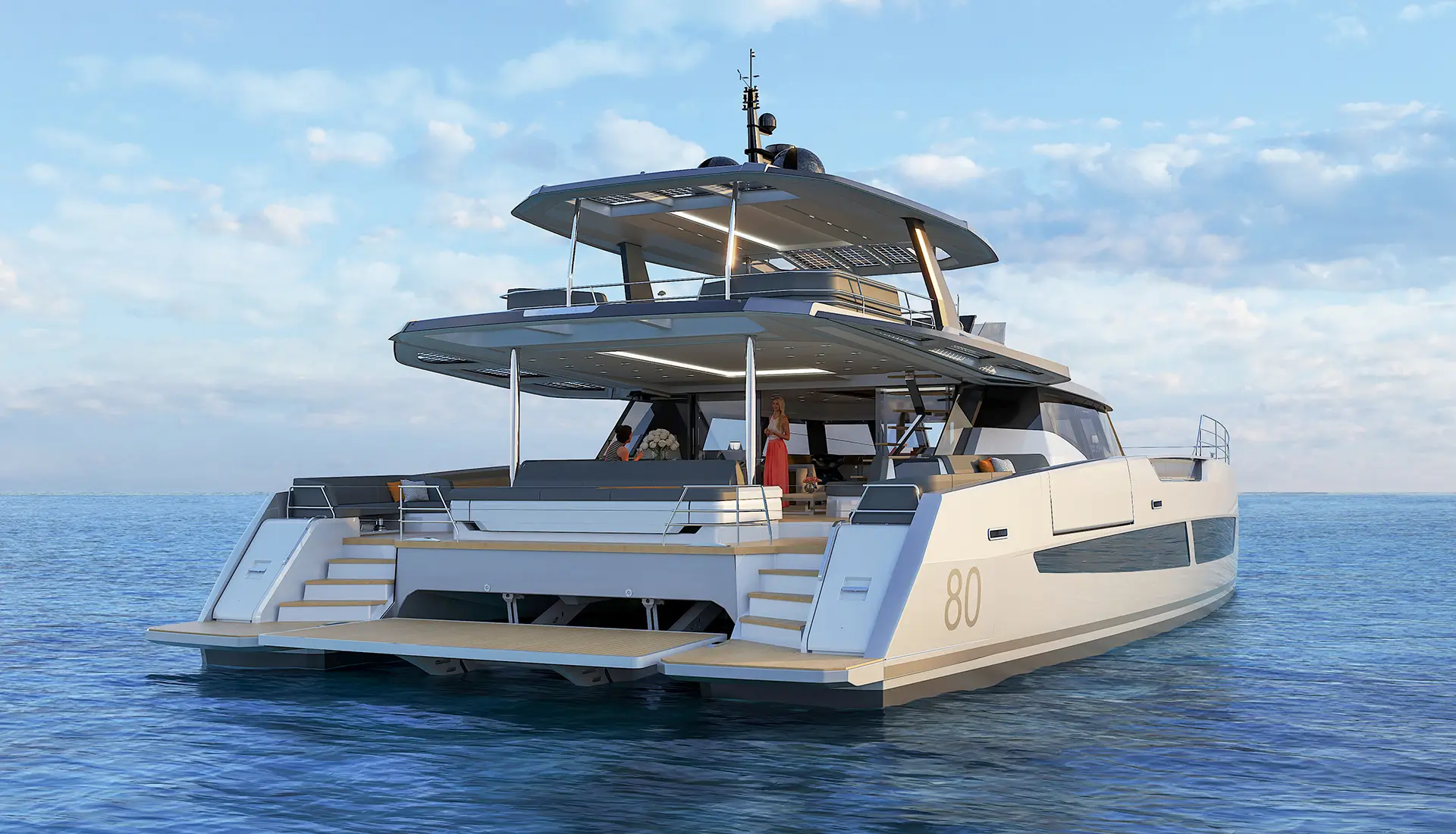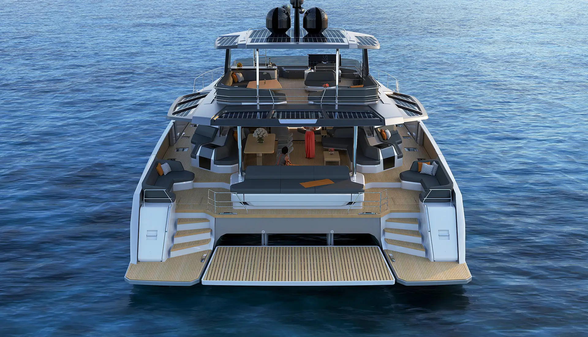 The yacht features extensive outdoor spaces that include a large flybridge with dining and lounging areas and a forward deck Jacuzzi with wet bar and sunbeds and an expansive aft cockpit for entertainment purposes. The main deck features fold-out balconies which provide direct access to the water for enjoying coffee in the morning or cocktails during sunset[...]
