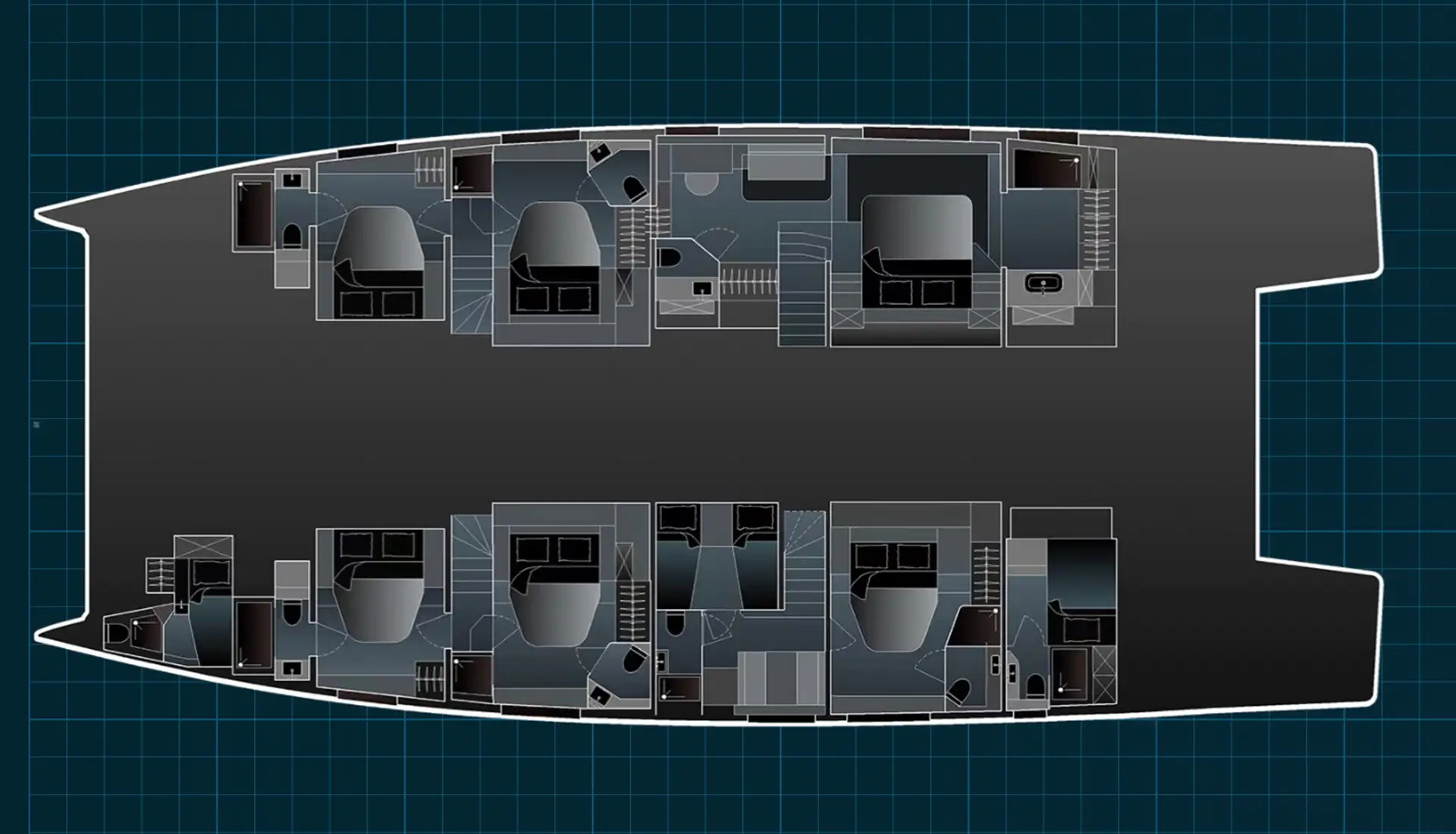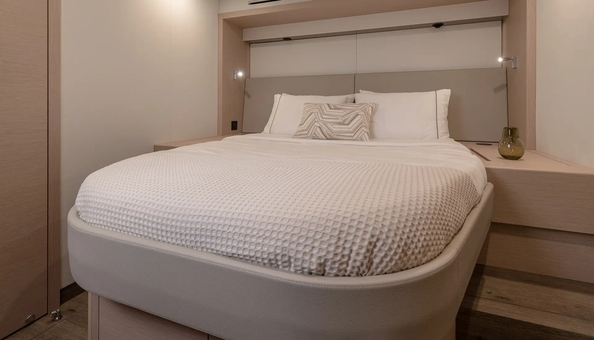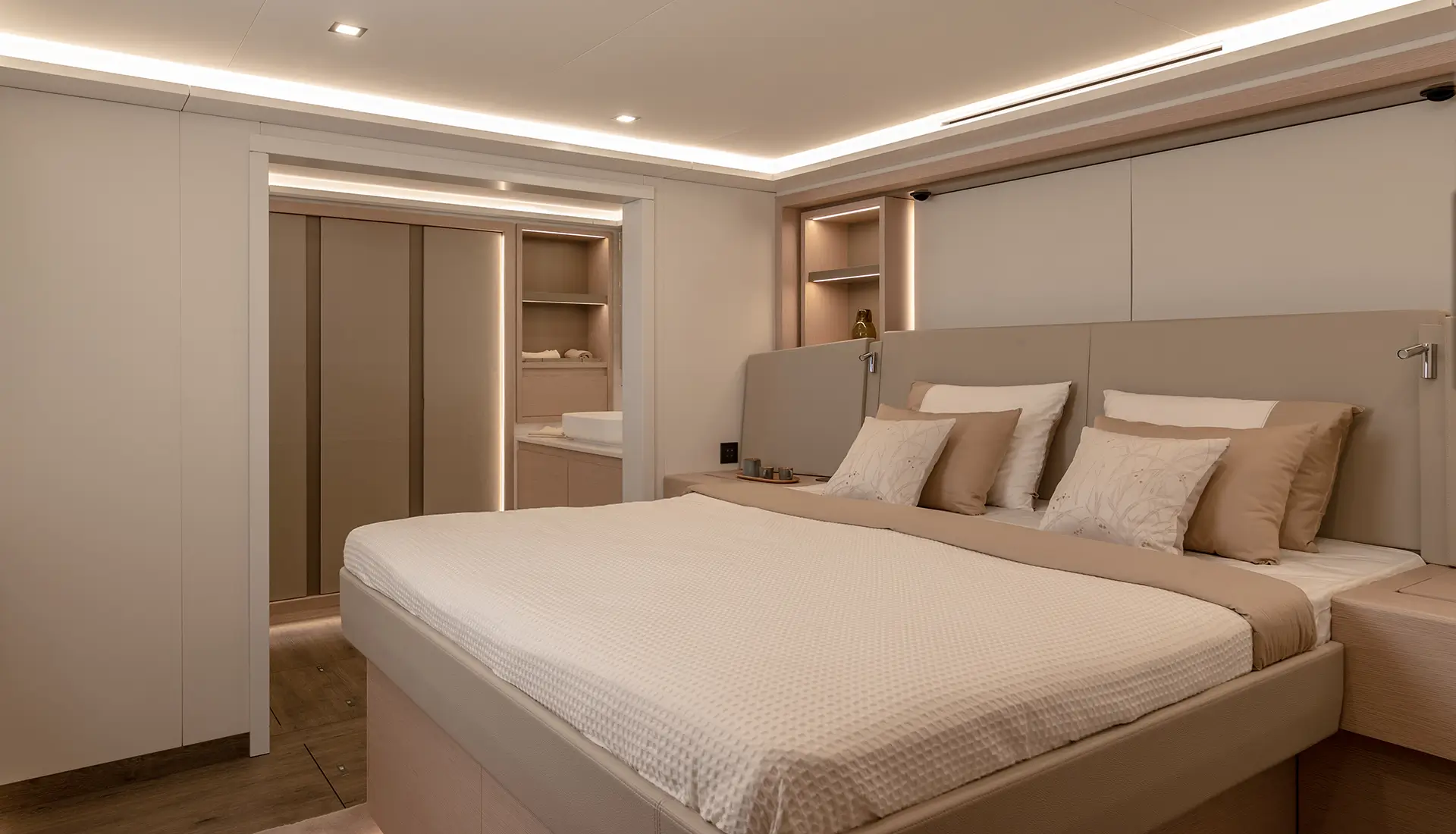 The Christal Mio 80 accommodates 12 guests through its 6 stylish cabins which include a spacious master suite with king-size bed and private bathroom facilities. The vessel provides six queen guest cabins with private bathrooms to ensure each guest has their own private space.