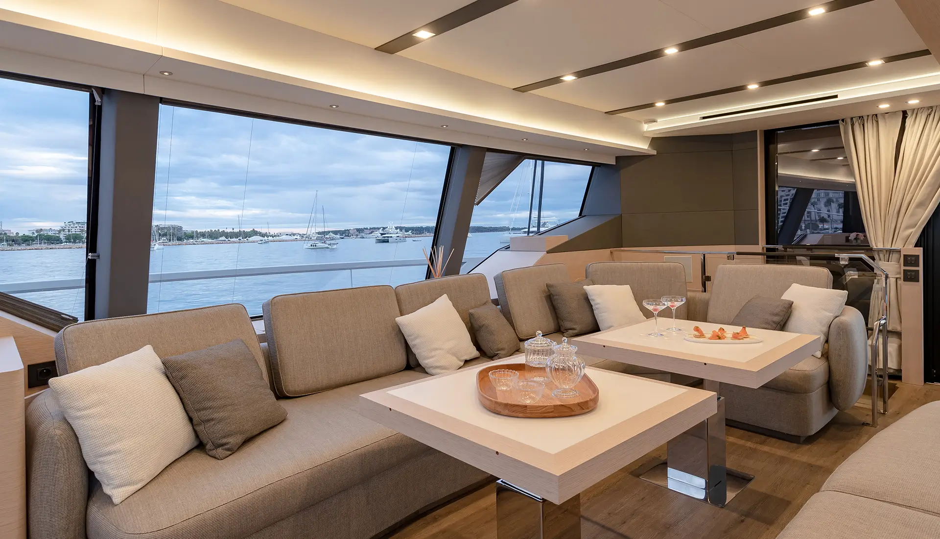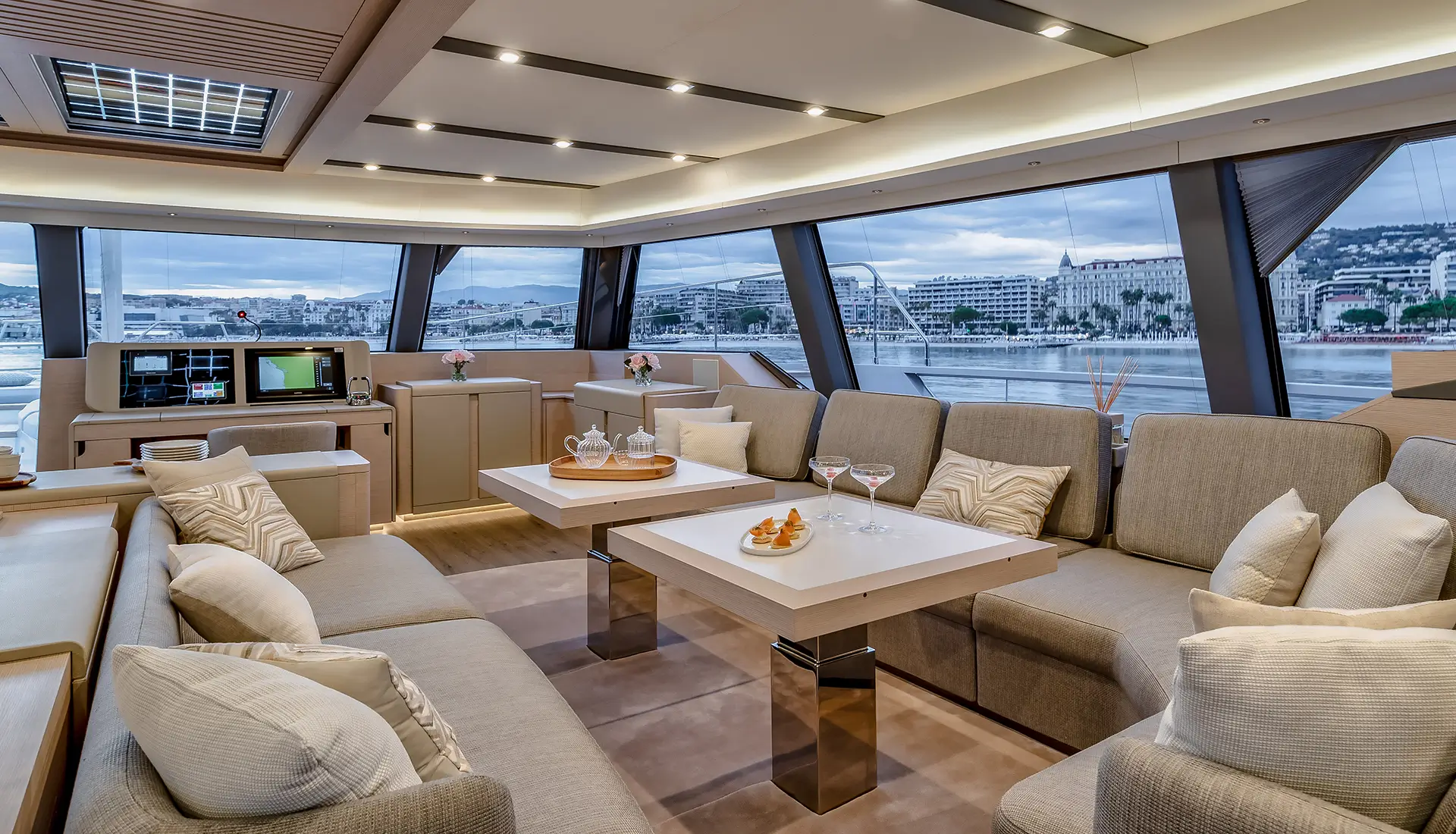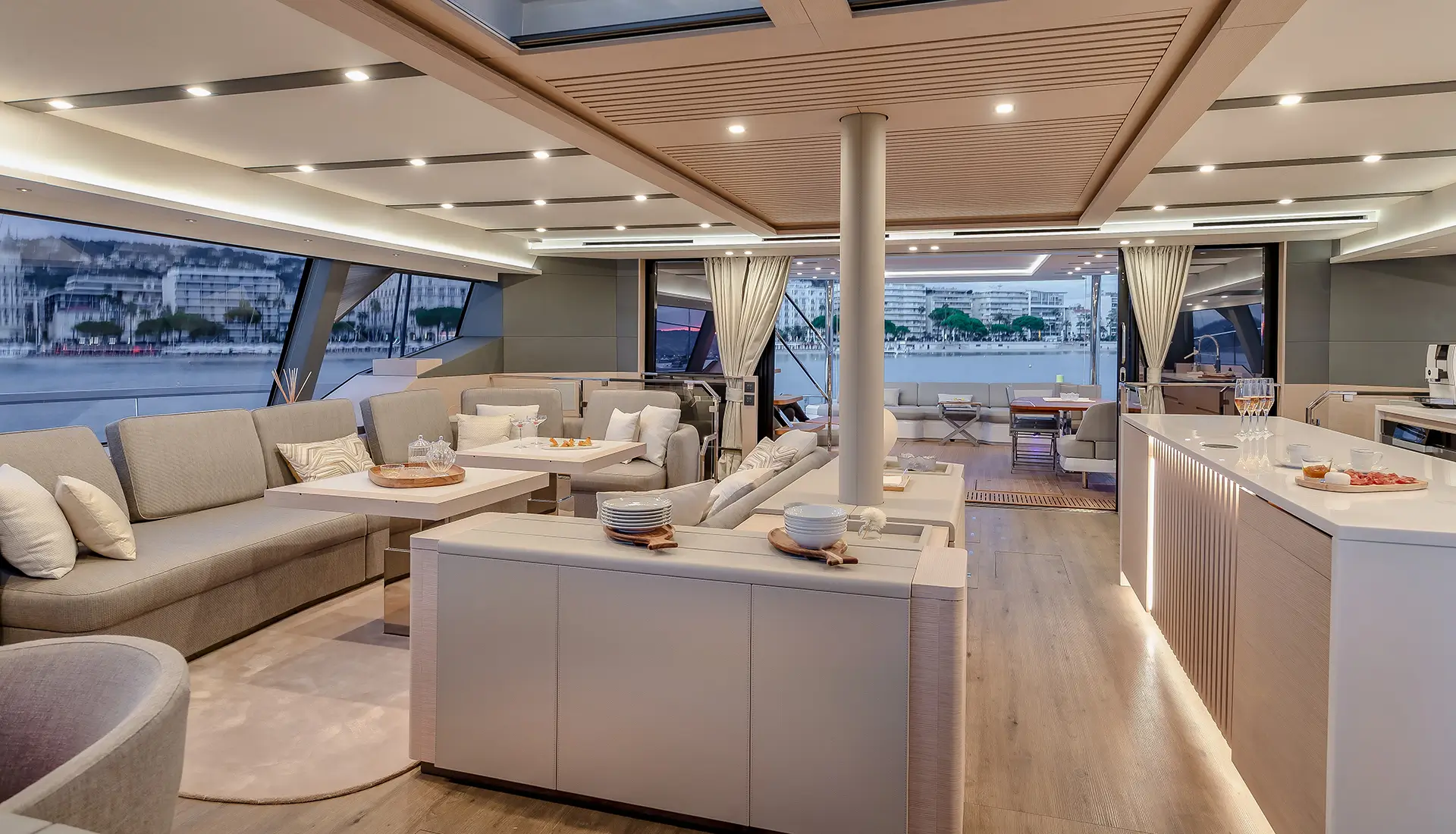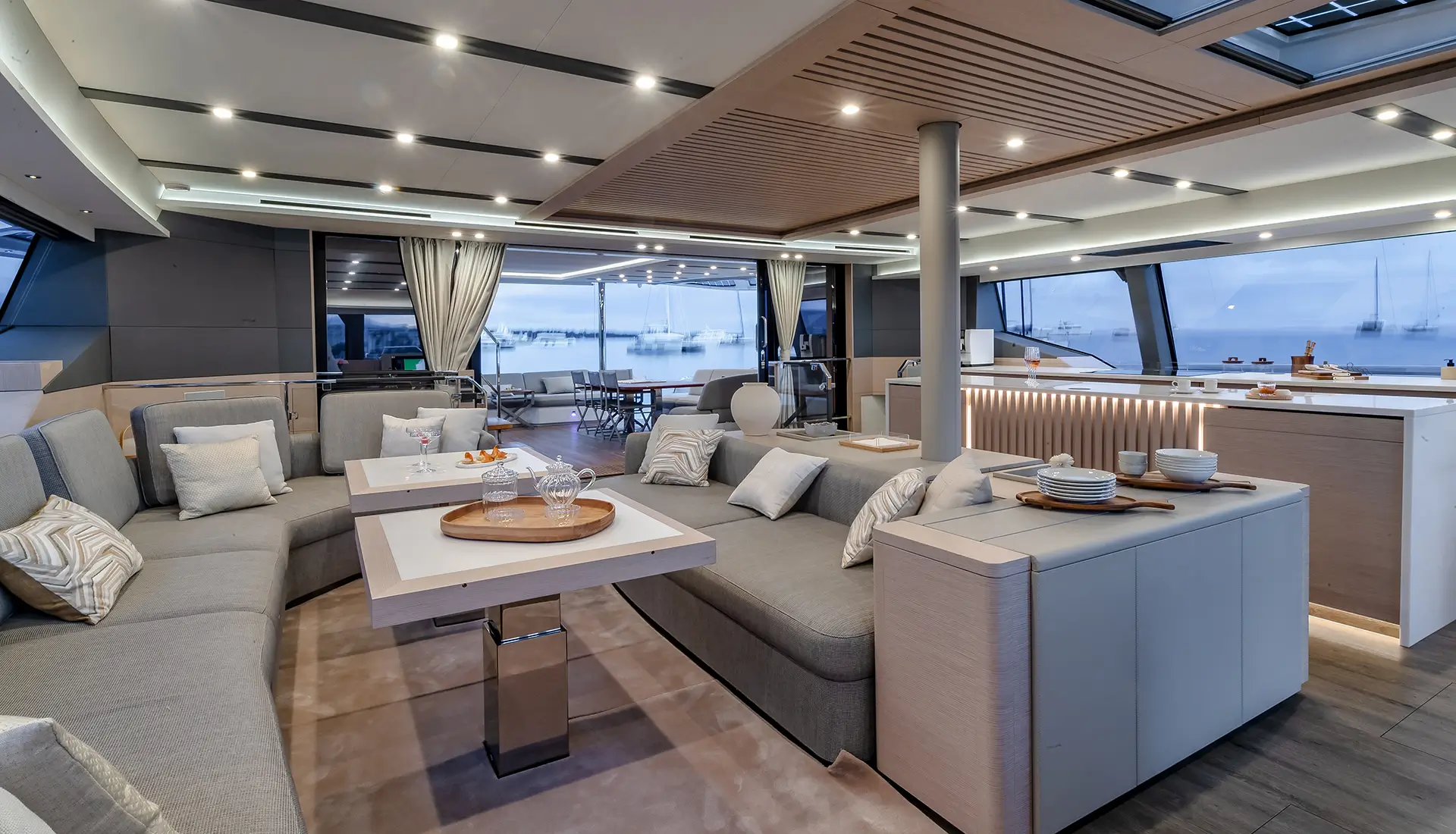 Light-filled interiors offer a modern, relaxed atmosphere onboard.