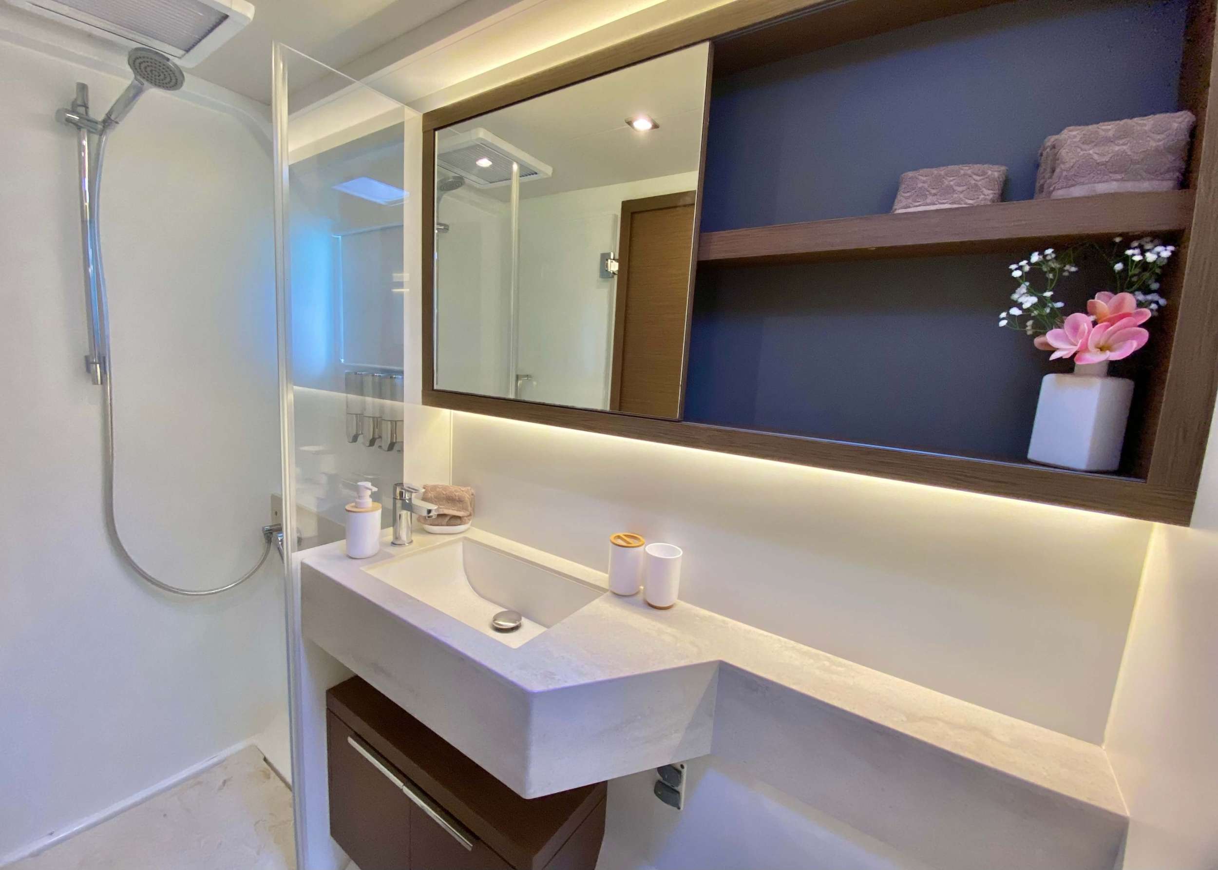 This new look model is finished to a very high quality and boasts every modern convenience. With 3 spacious queen cabins all with full ensuite bathrooms and a double cabin* (bathroom shared with the forward queen cabin).
