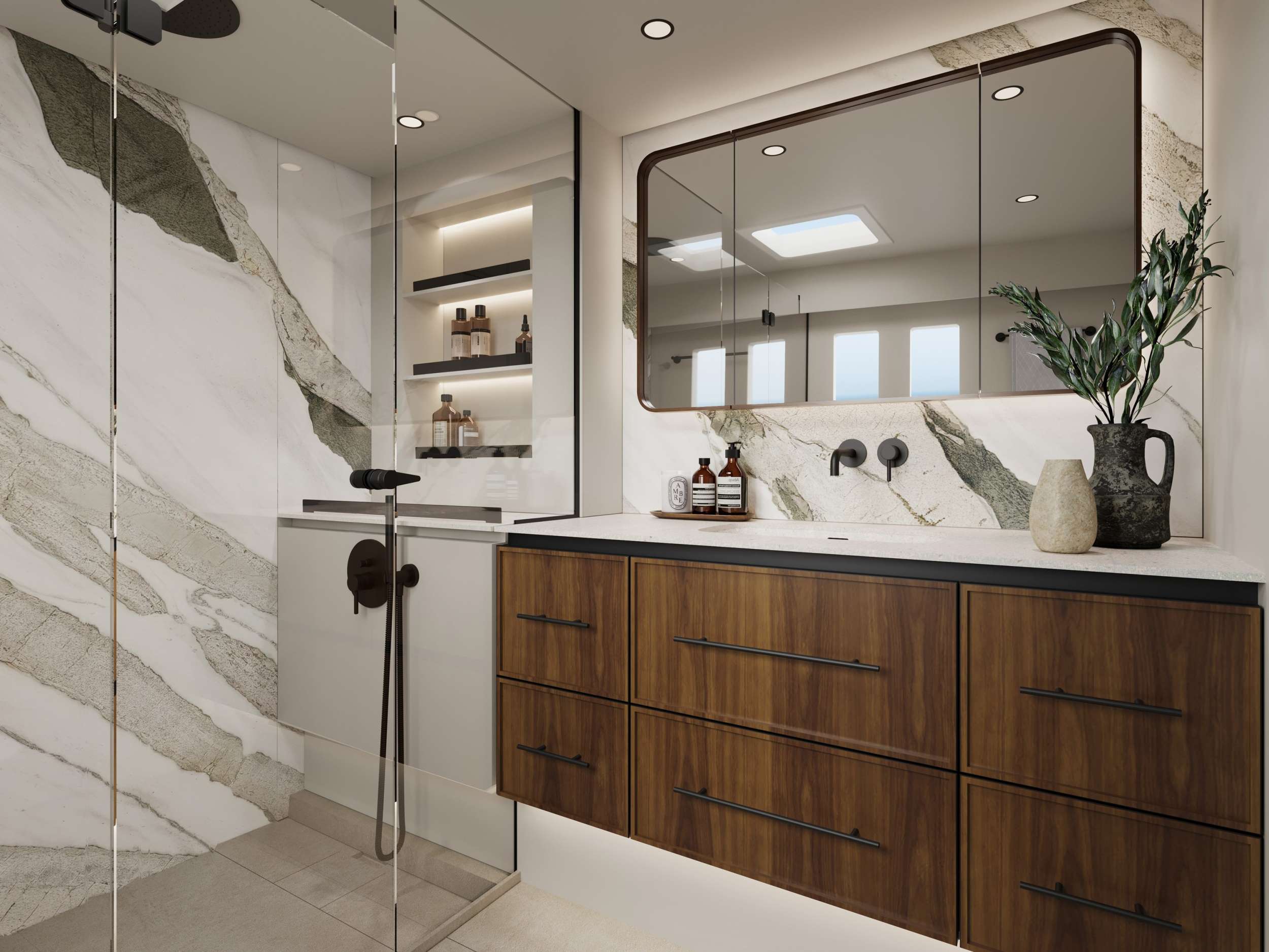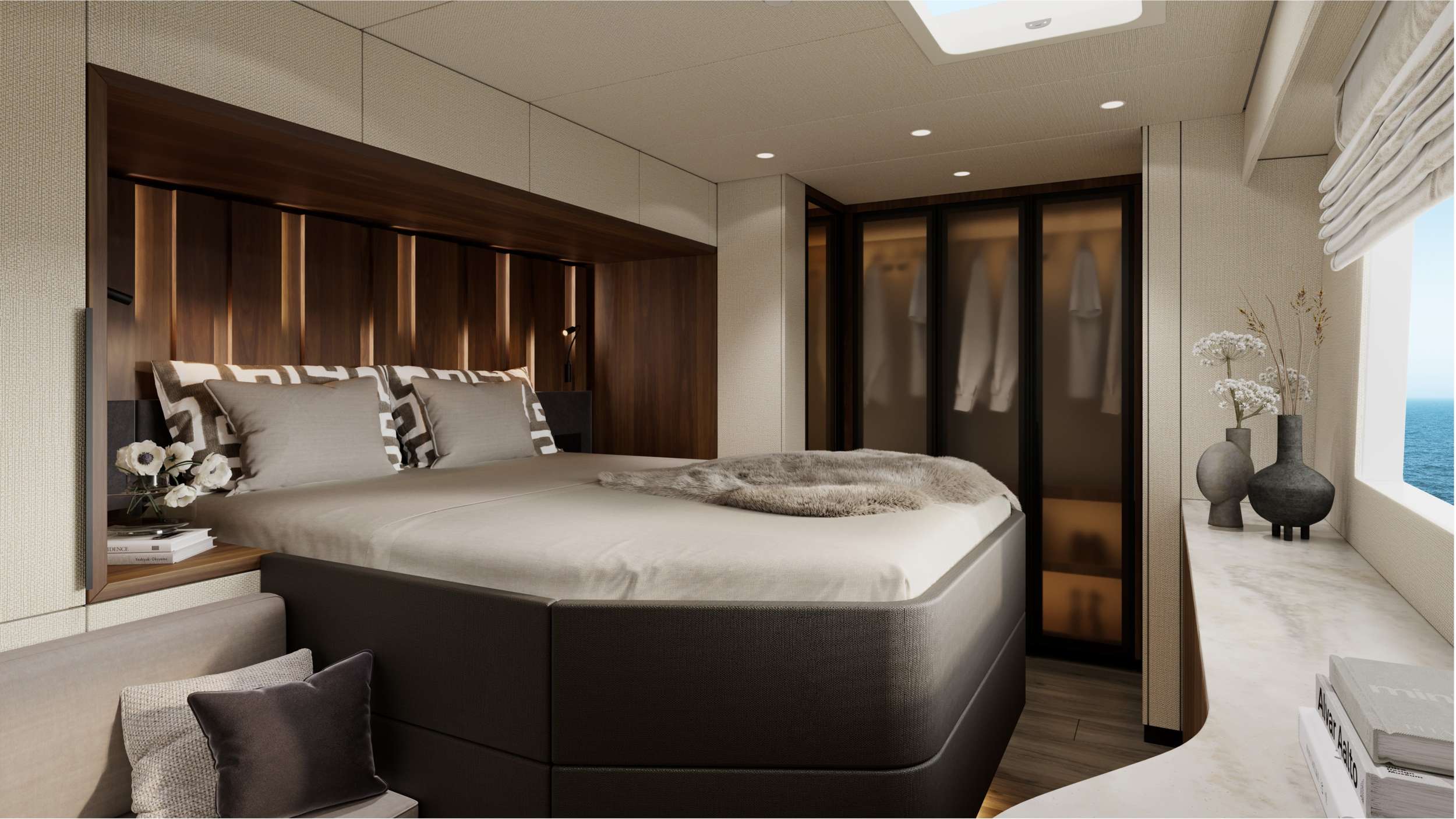 ENCORE is a 60′ Sunreef Yacht of pure luxury that offers the ultimate in luxury and comfort for up to 8 guests. She features an up-galley layout, an owner’s edition layout with a spacious king owner’s suite, and three additional queen cabins, all with en-suite bathrooms and stall showers. Each stateroom also has a smart TV and wireless charging pads on the bedside tables. The salon features a backlit marble bar with a pop-up TV, and all end tables have wireless charging pads.