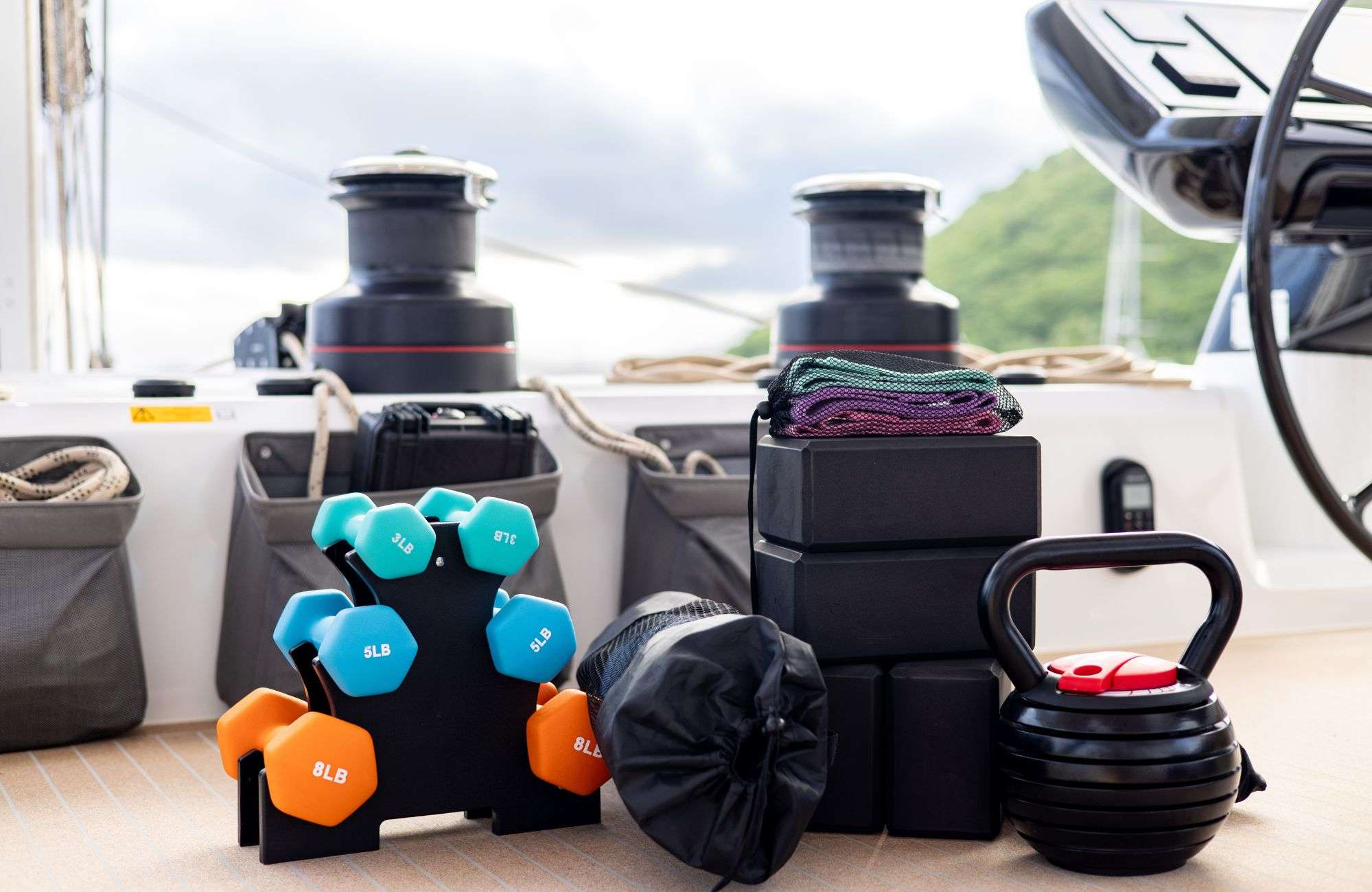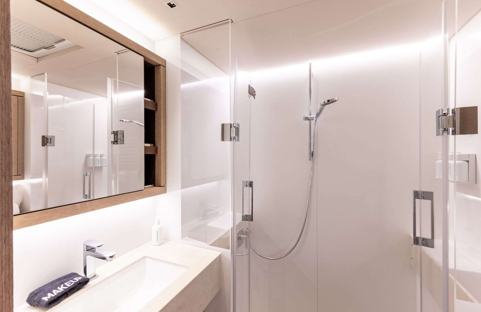 The impressive cockpit area boasts a beautiful dining table and bar area, along with multiple lounging options. Upstairs, the shaded fly-bridge provides added space and a great place to enjoy 360° views with a breeze while sailing or chilling at anchor. The foredeck has additional seating.