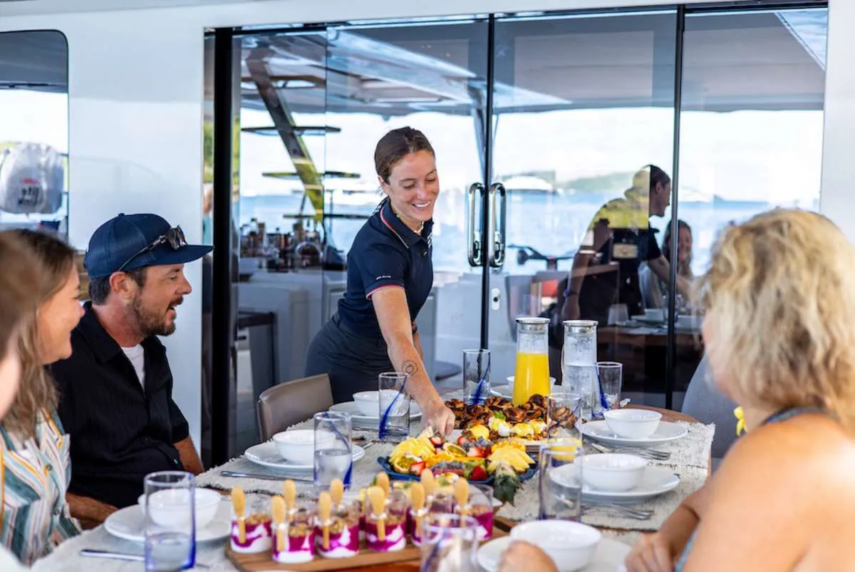 ENDLESS SUMMER can accommodate 10 guests in 1 king (can convert to two twin beds, if preferred) and 4 queen modern cabins, all with en-suite bathrooms and showers. Launched in summer 2024 and continuing the legend of the Endless Summer charter yachts of the ’80s and ’90s, Endless Summer III is the latest edition of the Lagoon 65 Catamaran incorporating many new eco-friendly features: extensive renewable energy systems, lithium power bank, sustainably sourced cork decking for cooler decks, and reduced generator use delivering more ultra quiet time and lower emissions.