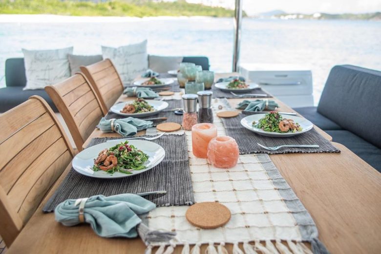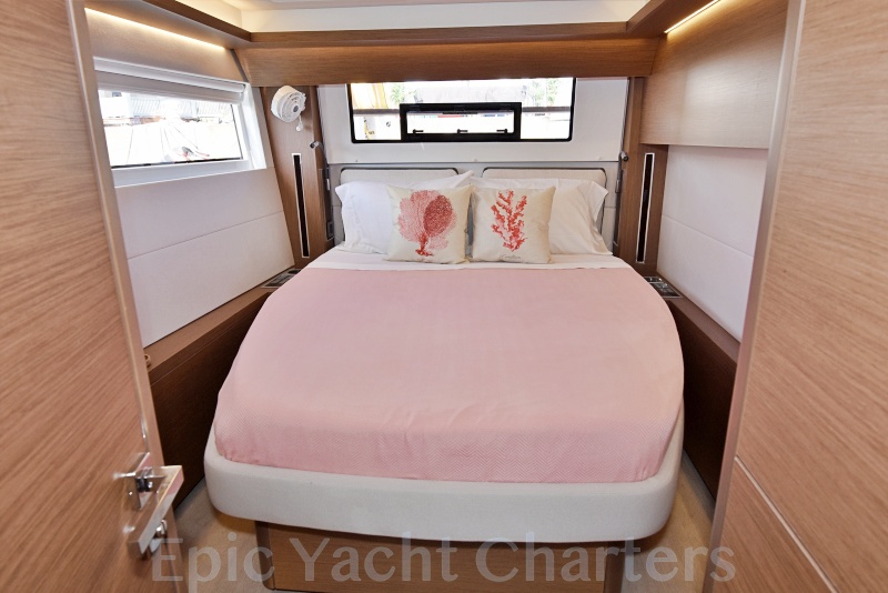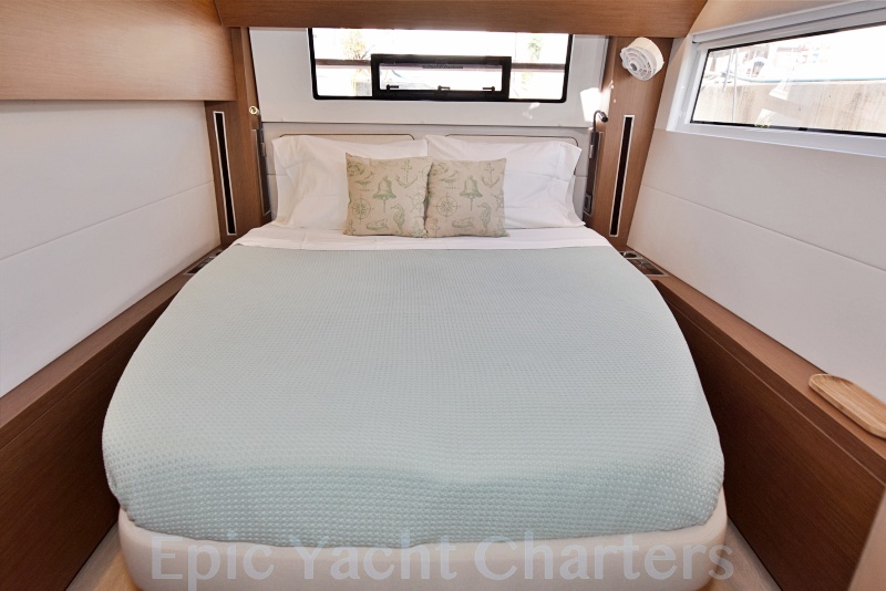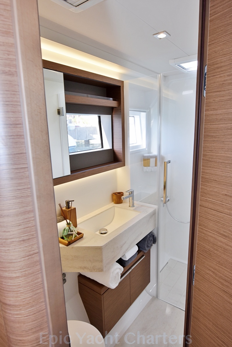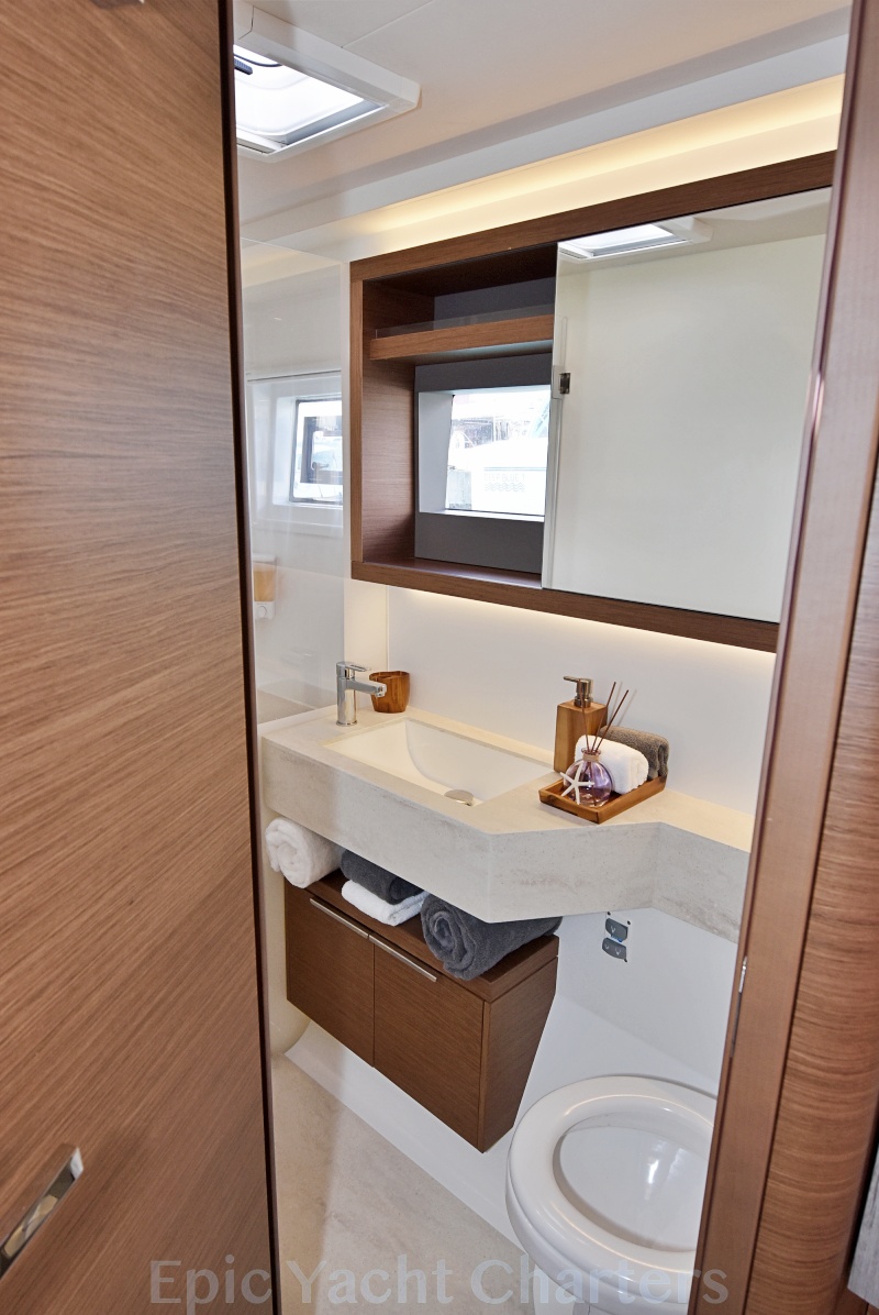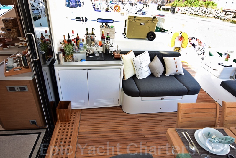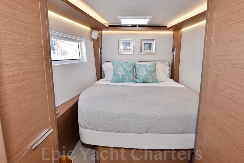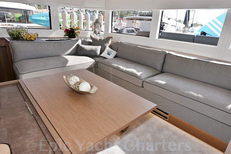KARMA can accommodate 8 guests in 3 queen cabins & 1 full midships cabin with 3 en-suite bathrooms. The light and inviting salon is bright and spacious with a modern feel. The U-shaped sofa offers a comfortable place to relax with your morning coffee while your chef prepares your breakfast.