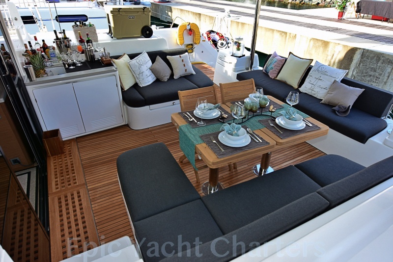 The cockpit follows the same theme as the interior with neutral upholstery that complements the teak decking. The large dining table comfortably seats 8 guests to enjoy delicious meals with an amazing view. The whole area is well protected from the elements with drop-down shades and a large Bimini sunshade allowing you to relax out of the sun[...]