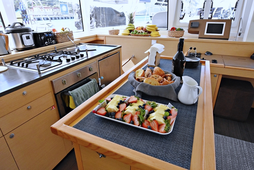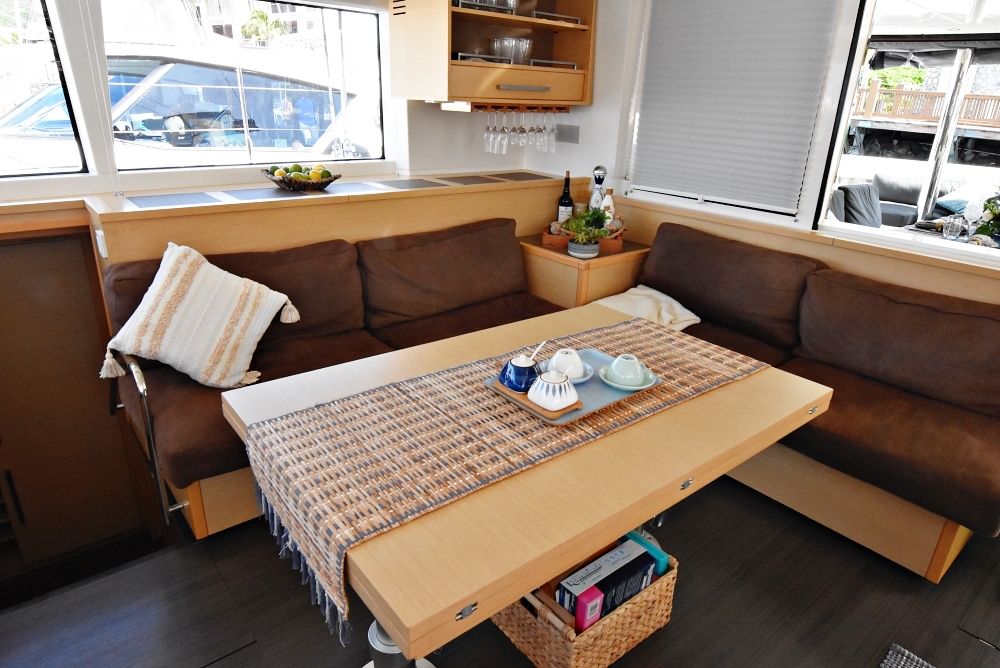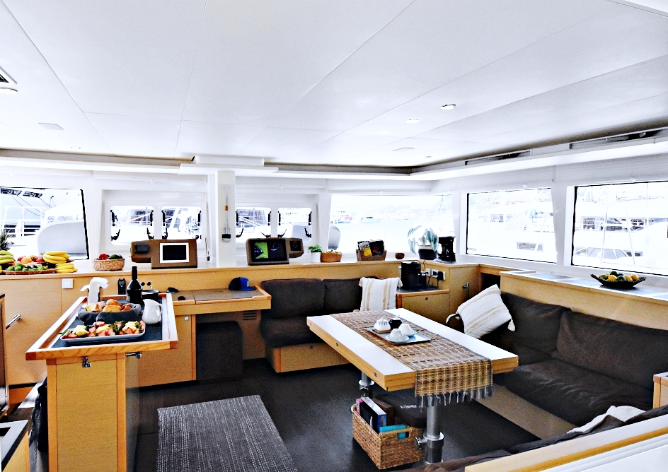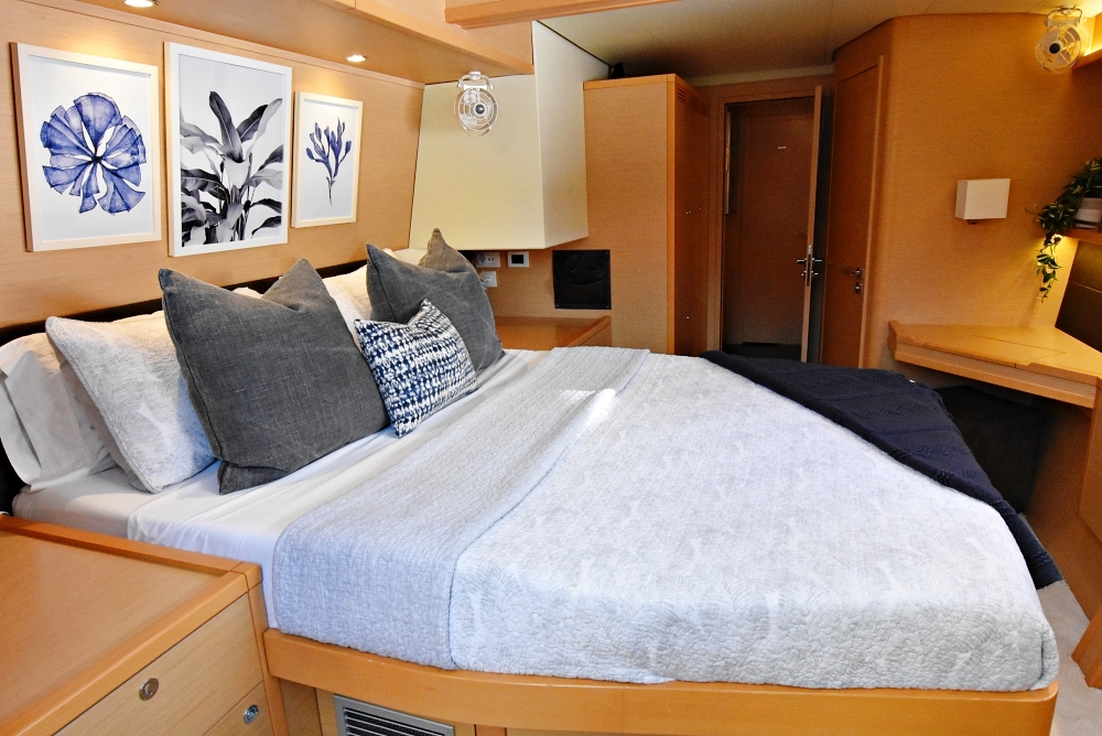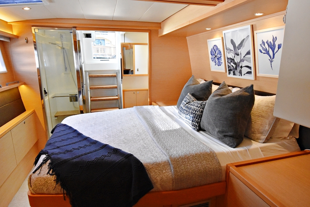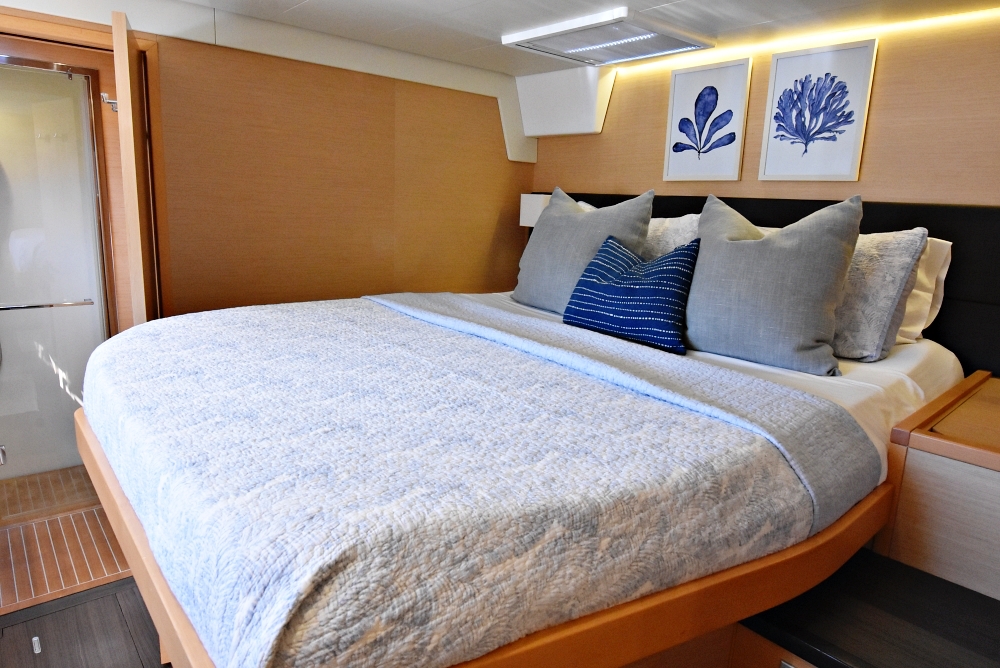 The Glorious Lagoon 560 is extremely comfortable for up to 6 guests in three en-suite queen staterooms. All have exceptional natural lighting via the vast hull windows with two of the cabins having direct access to the aft deck. Indirect lighting in both the salon and cabins makes for a relaxing feel.