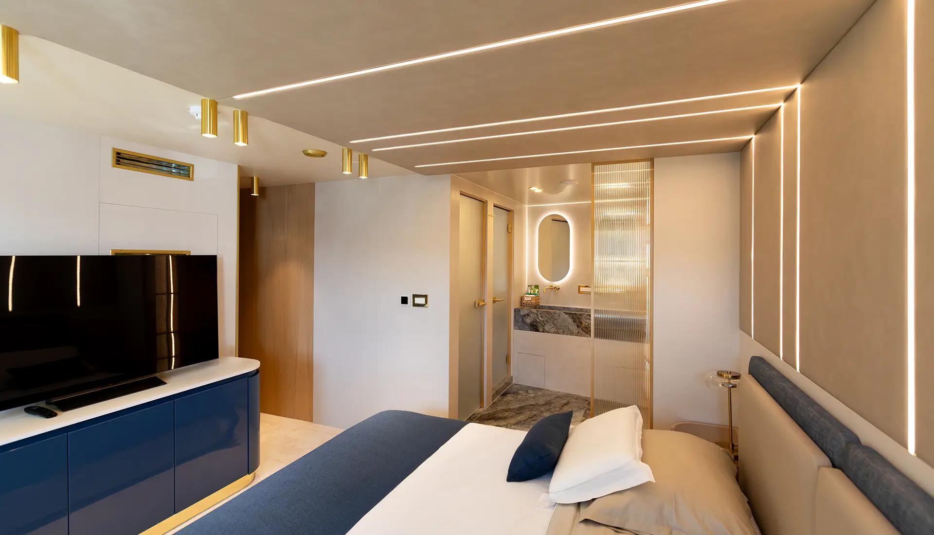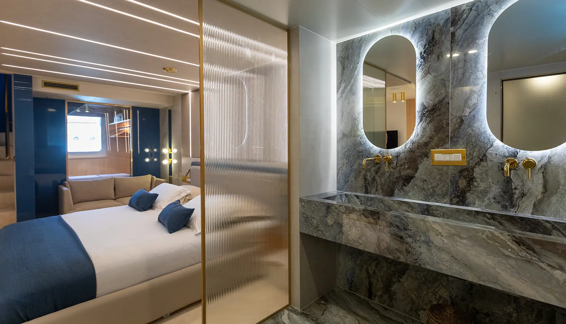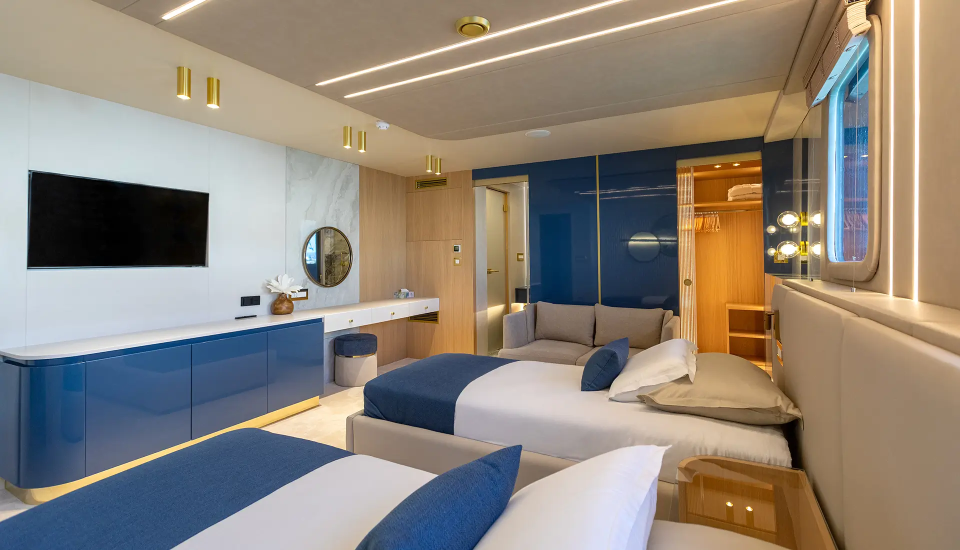 Step into a world of refined sophistication with six extraordinary cabins, including a full-beam Master and VIP suite that rival luxury hotel penthouses. Each features lavish marble bathrooms, while four additional cabins offer versatile king-or-twin configurations to suit any group’s needs.