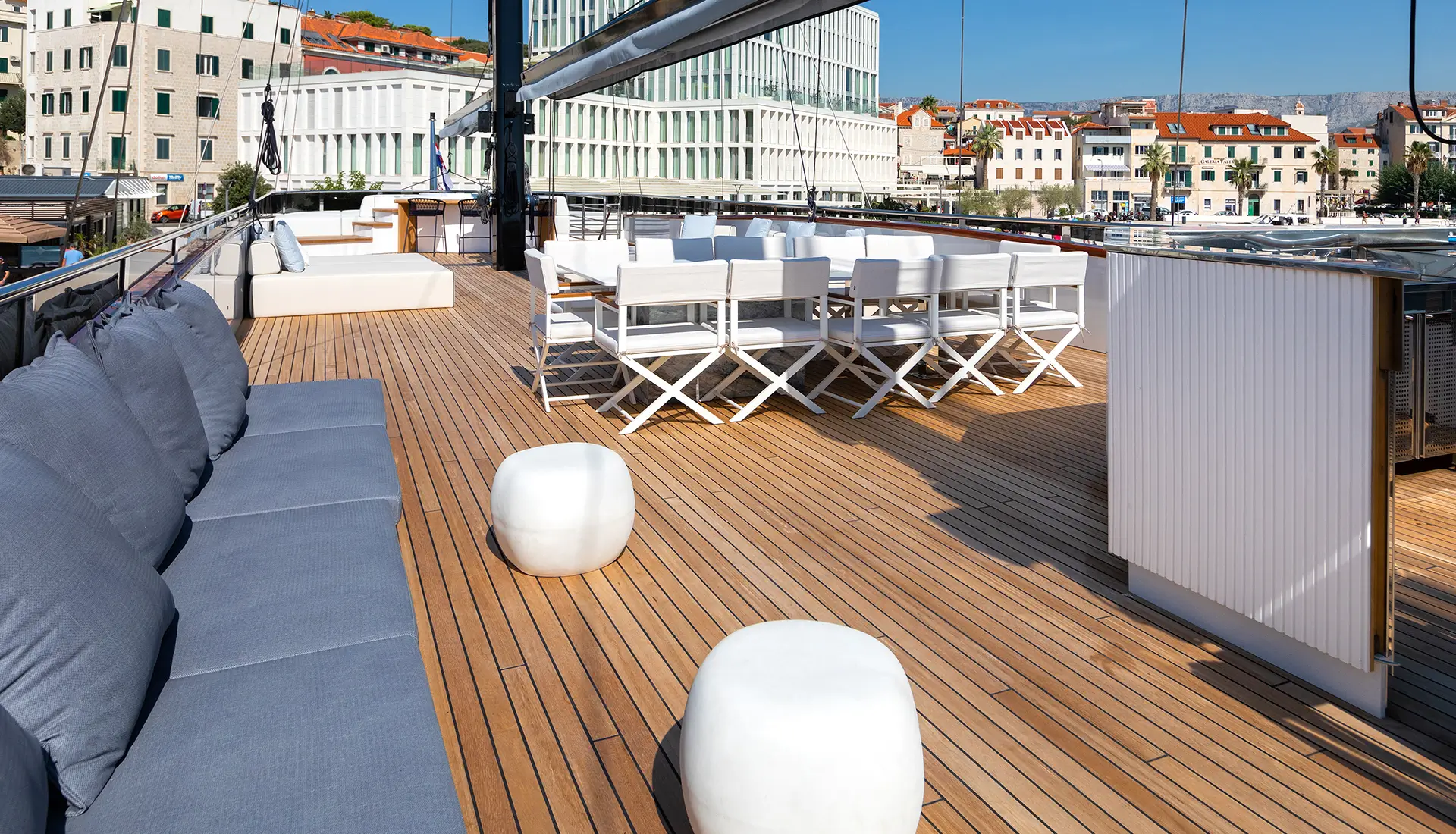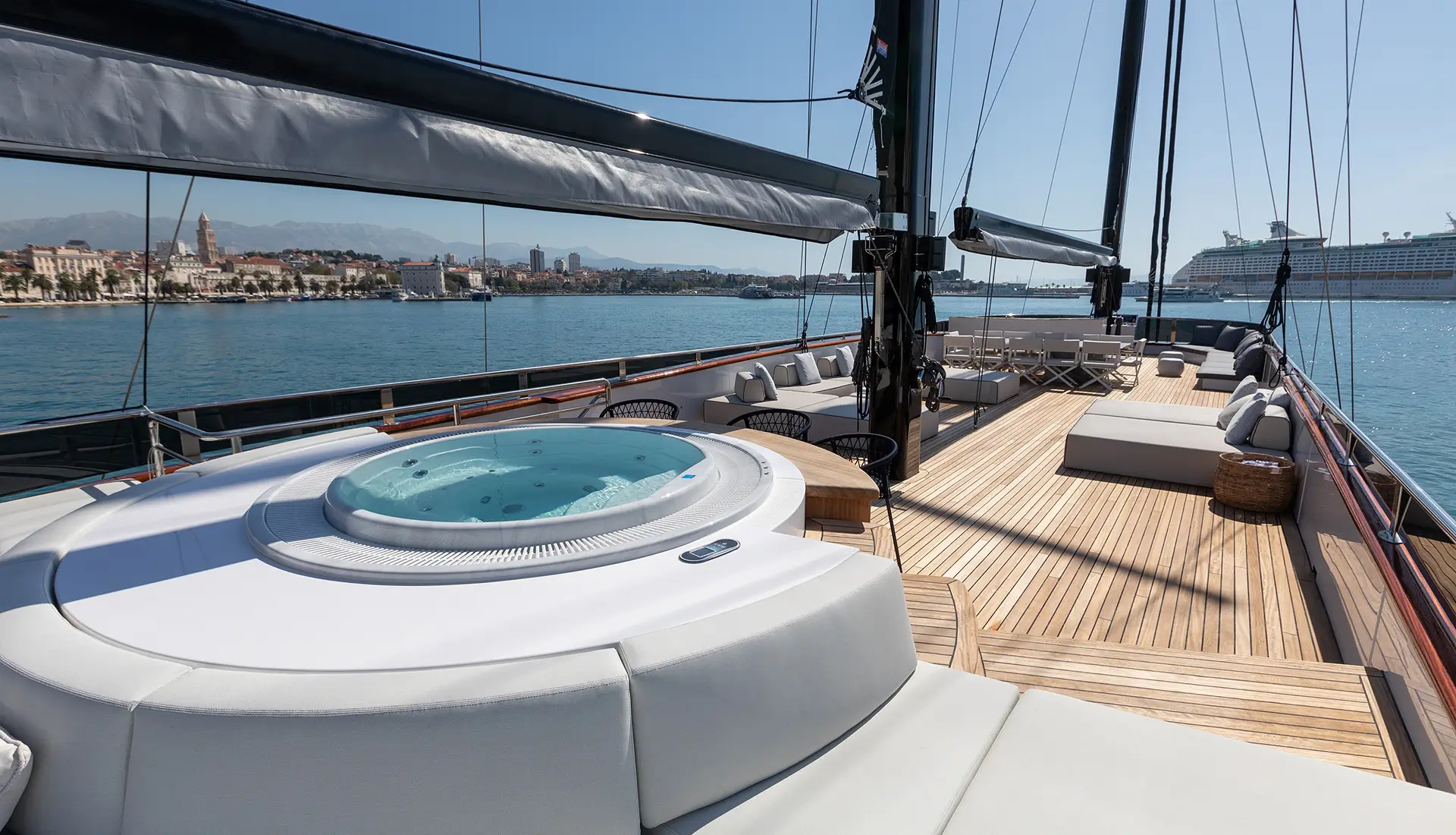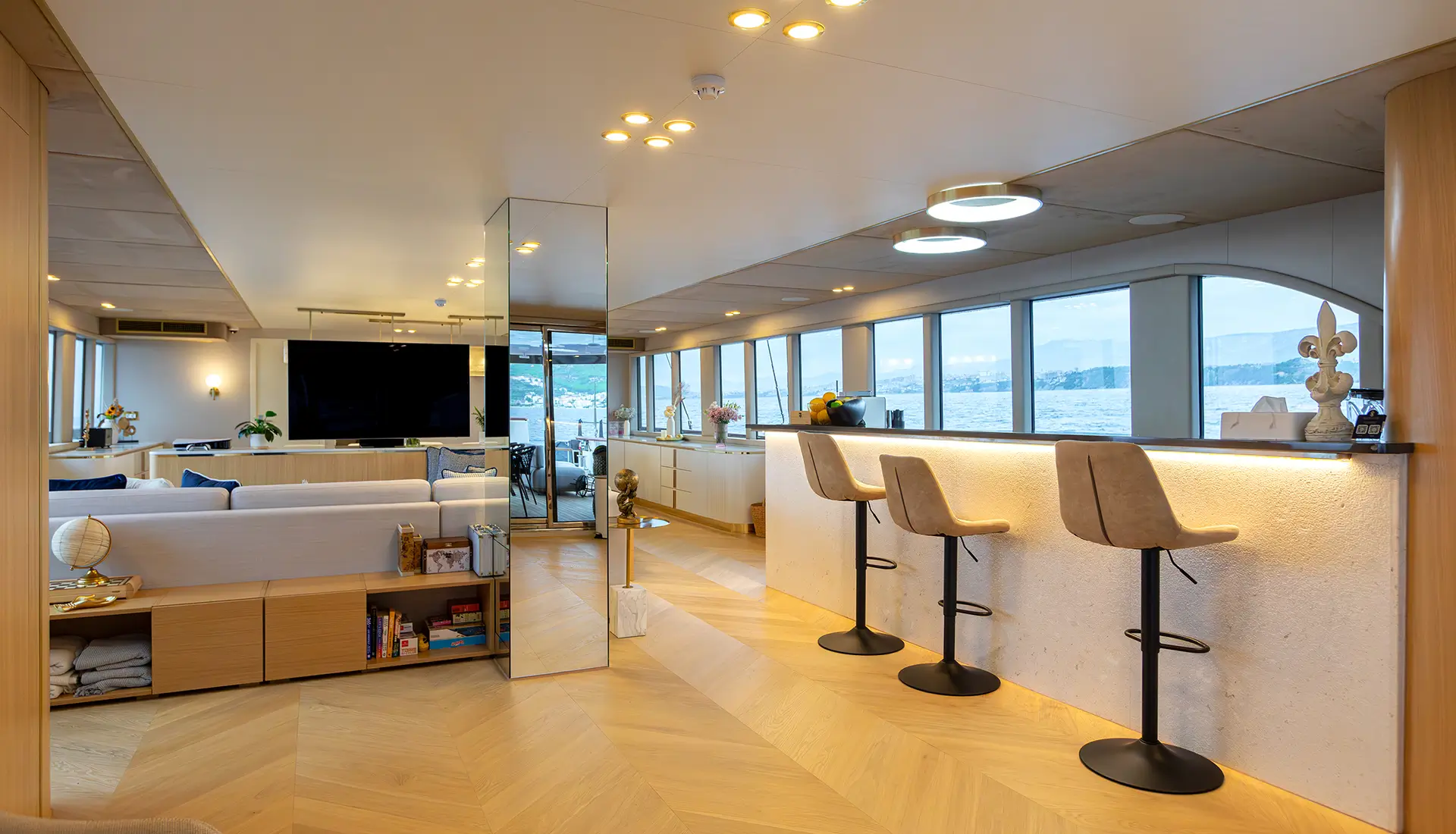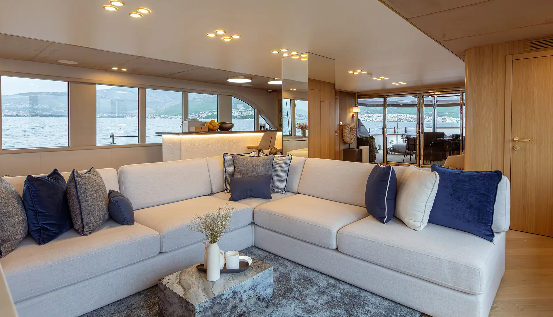 The main deck unfolds like a floating paradise, featuring an elegant salon that flows into an alfresco dining haven. A unique foldout balcony creates an intimate perch above the waves – perfect for morning coffee or sunset cocktails[...]