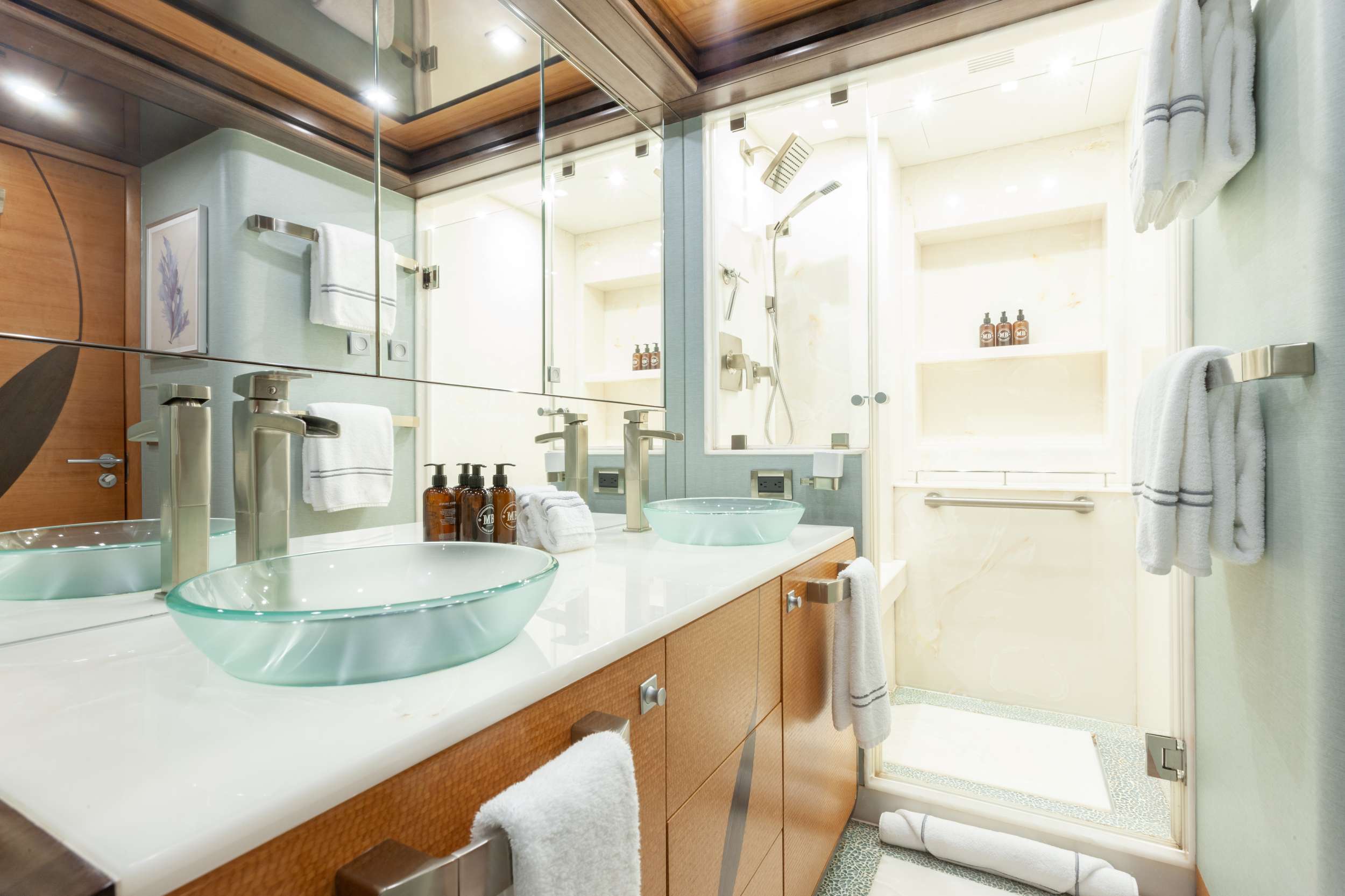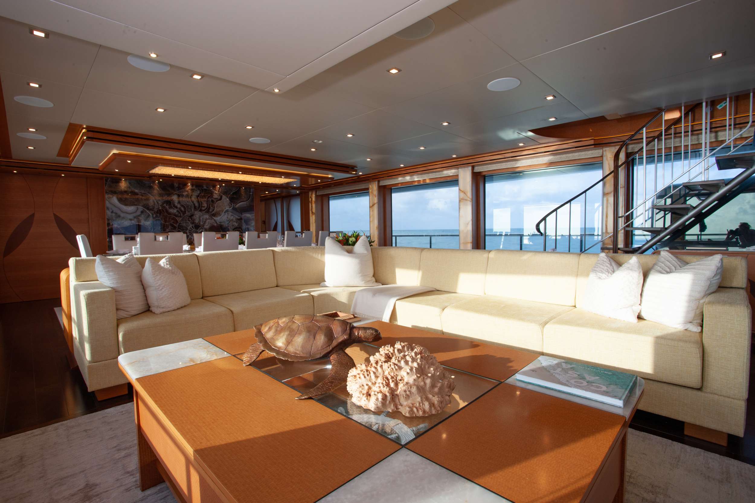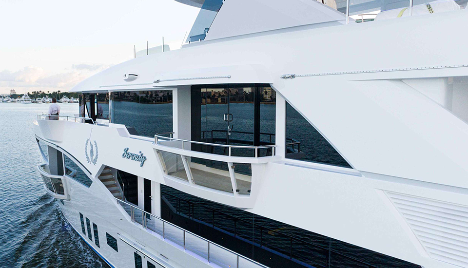 SERENITY 133, designed by Evan K. Marshall, elevates sea travel with its elegant features. Its interior boasts an elevator linking four decks, large windows, illuminated floors, and onyx accents. It comfortably hosts 12 guests in six staterooms, offering vast areas for leisure and enjoyment. The flybridge is a highlight, featuring a jacuzzi with a waterfall and a cozy wading pool under skylights. The ZLift system in the garage/beach club serves as an innovative underwater platform for sea activities and a swim platform[...]