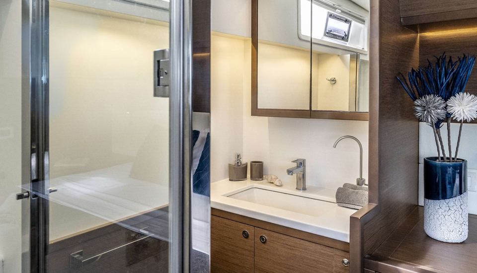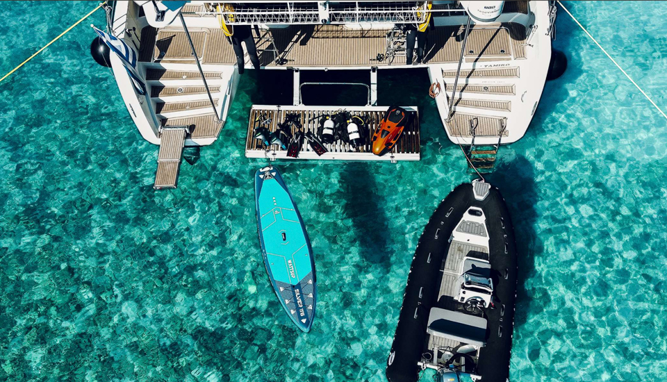Enjoy its spacious interior and stylish outdoor spaces for entertainment and relaxation. Tamiro is like your dream floating villa. Features include a professional crew of 2, high-standard equipment, a tender lift system, eco-friendly solar, and lithium power, SCUBA equipment available, a “smart Japanese toilet” in the primary cabin, plus high-speed internet and TV for your enjoyment.