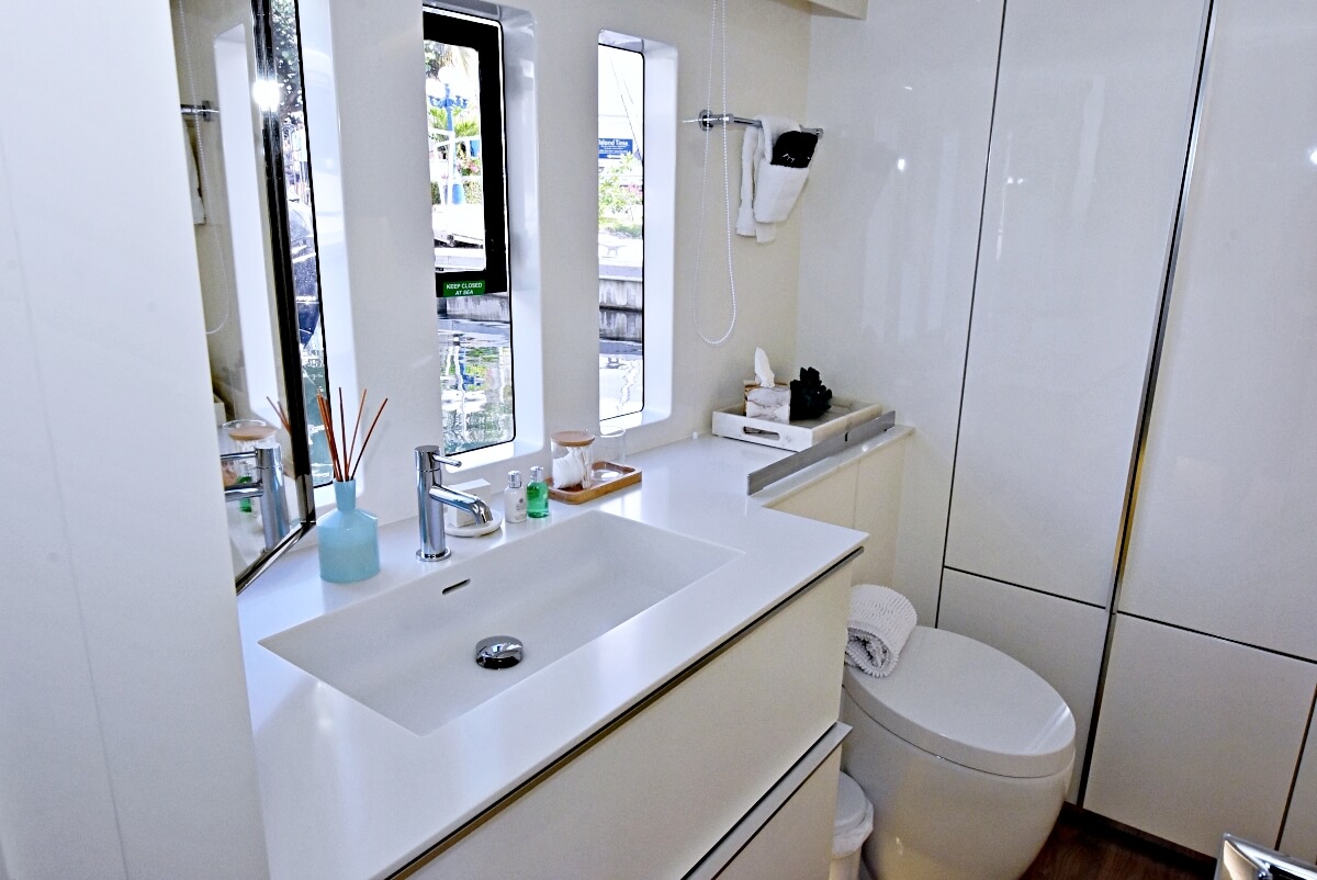 UNWAVERING has a 3 ensuite, queen cabin layout to accommodate 6 guests in luxury and style. The Sunreef 50 is an all-around luxury sailing yacht ideal for getaways and adventures. Her clever bridge deck and superstructure design allow for a superior level of comfort onboard whereas the generous teak use and classy lines underscore her modern style with a classic edge. Her saloon opens both onto the comfortable bow terrace and the yacht’s cockpit, which is extended with a hydraulic aft platform. The hulls provide impressive volumes, luxurious guest cabins, and an opulent master suite with an immense bathroom. While housing the main helm, the large flybridge is dedicated to leisure with more than enough space for 8+ guests, a fully-equipped wet bar, and large sun pads[...]
