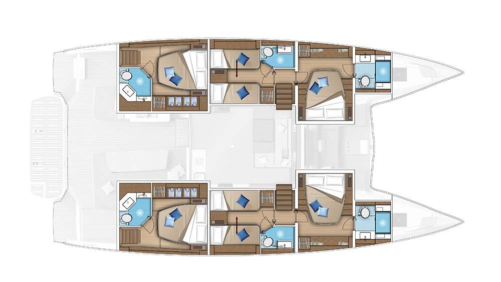 VALIUM 55 is a luxury catamaran that accommodates up to 10 guests in 4 queen cabins plus 1 twin (convertible to queen), each with its ensuite bathroom. The cabins are spacious and comfortable, each with its unique décor. All of the cabins have plenty of storage space and natural light.