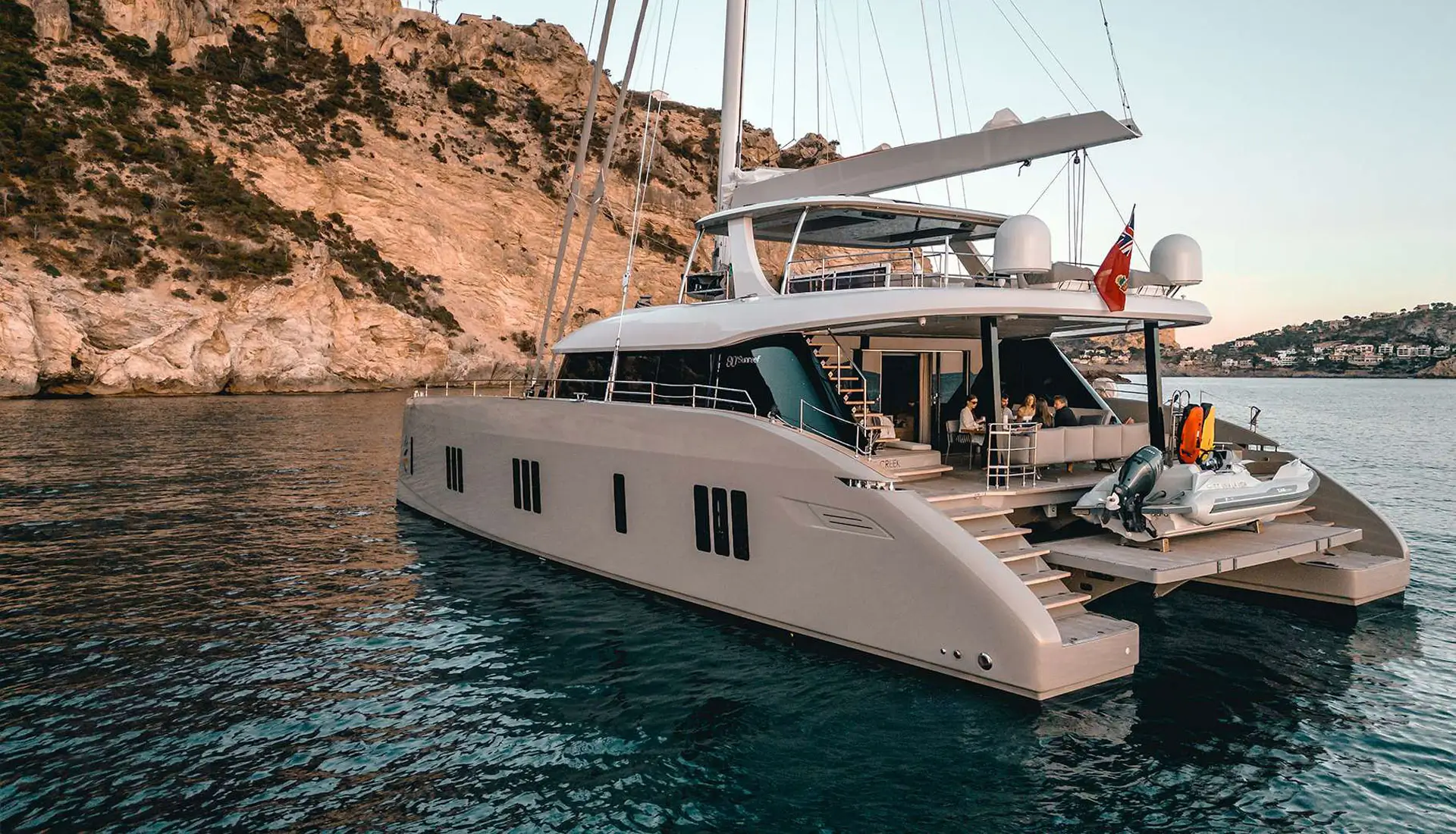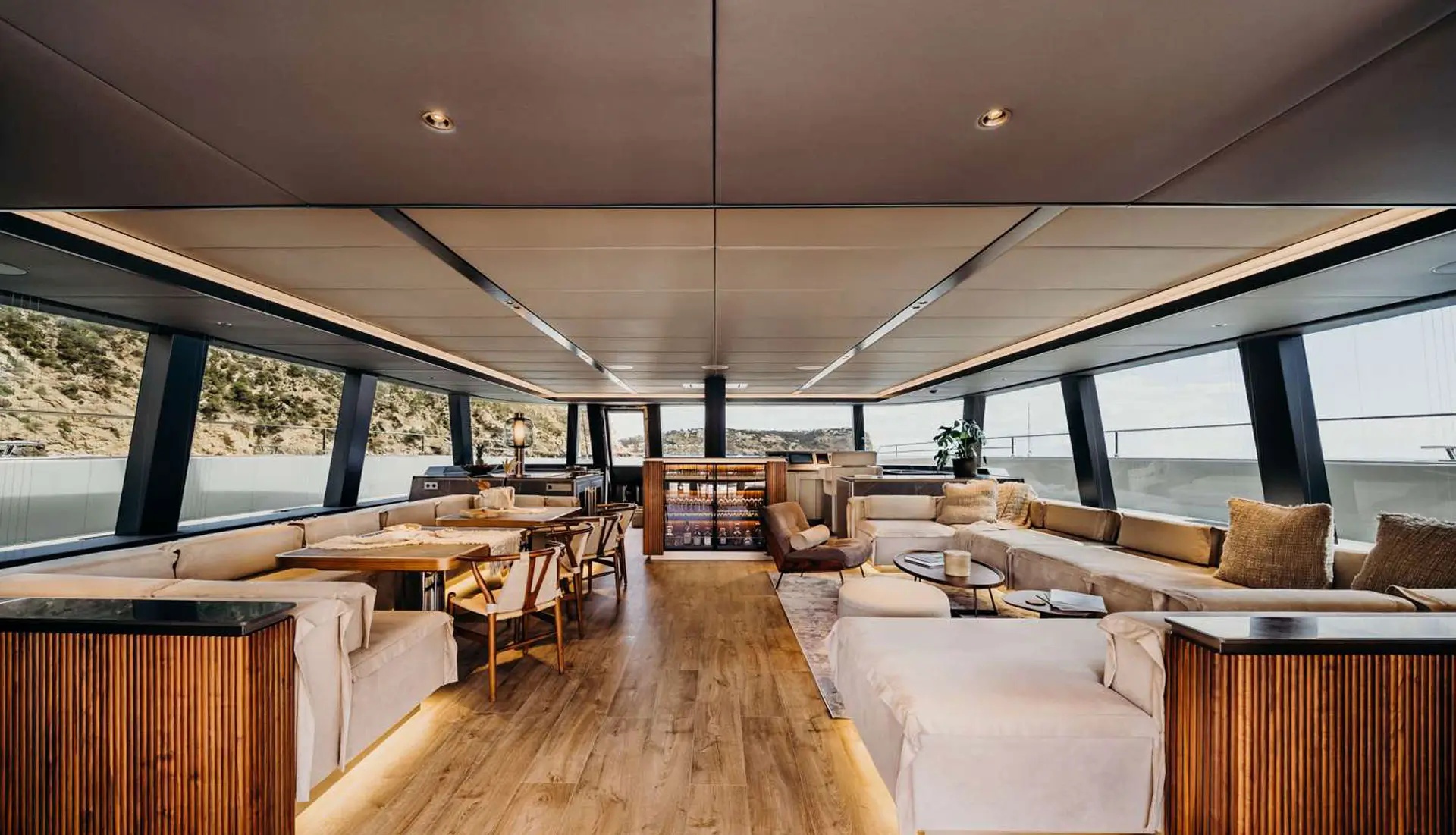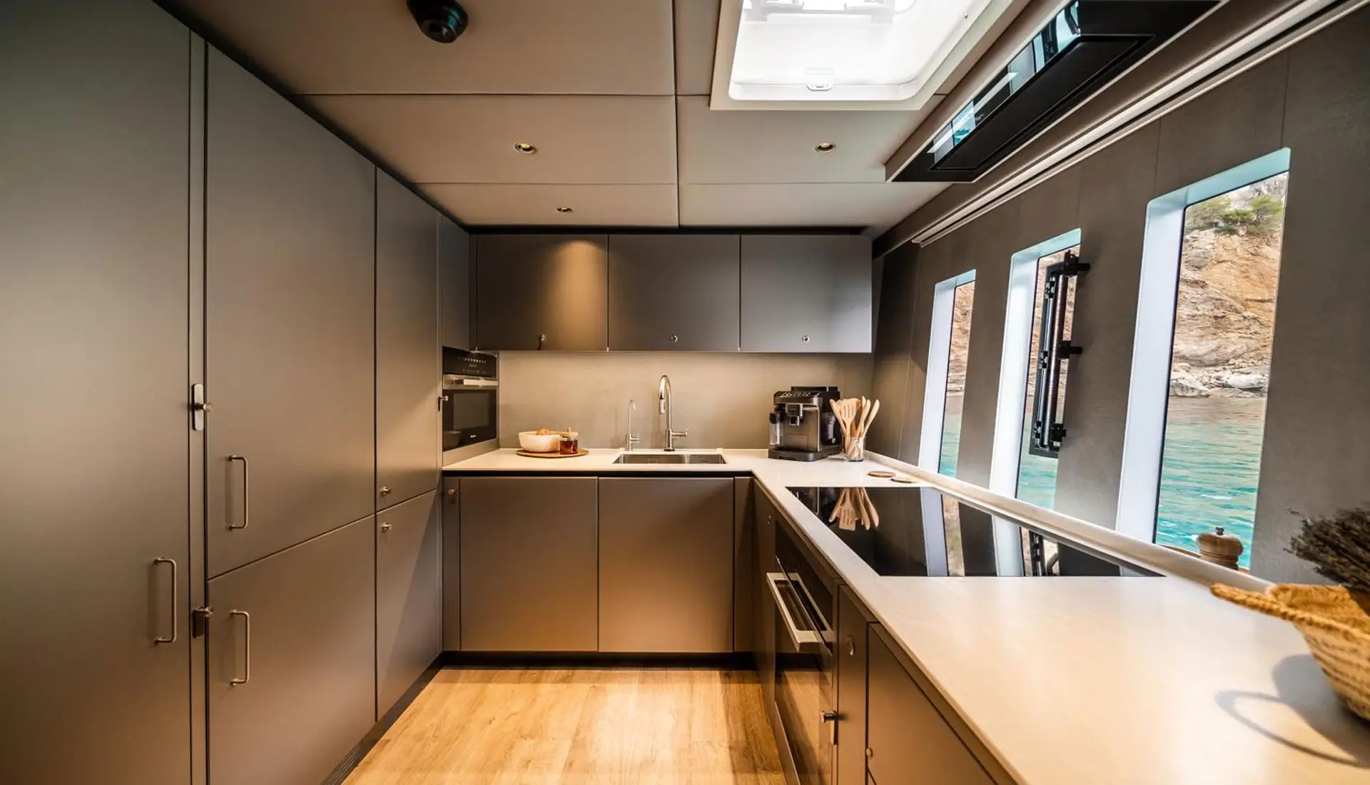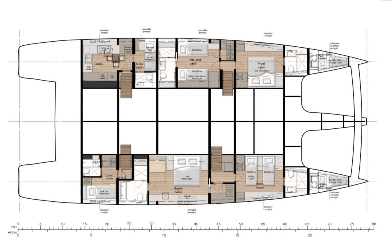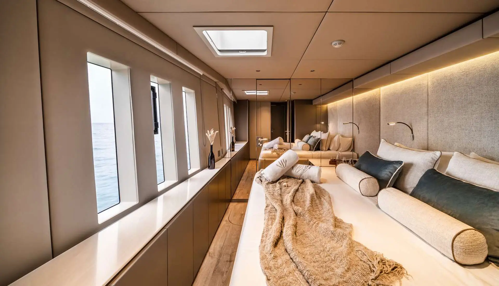 Her vast salon is a statement of elegance, fitted with bespoke décor, wooden flooring, and panoramic windows that admit natural light to stream through the space unimpeded. There are four well-appointed cabins, each with en-suite facilities, below deck, ideal for up to eight guests in double beds, with an additional guest in a Pullman berth. Outdoor living is at its finest, with multiple alfresco areas created for relaxation and entertainment.