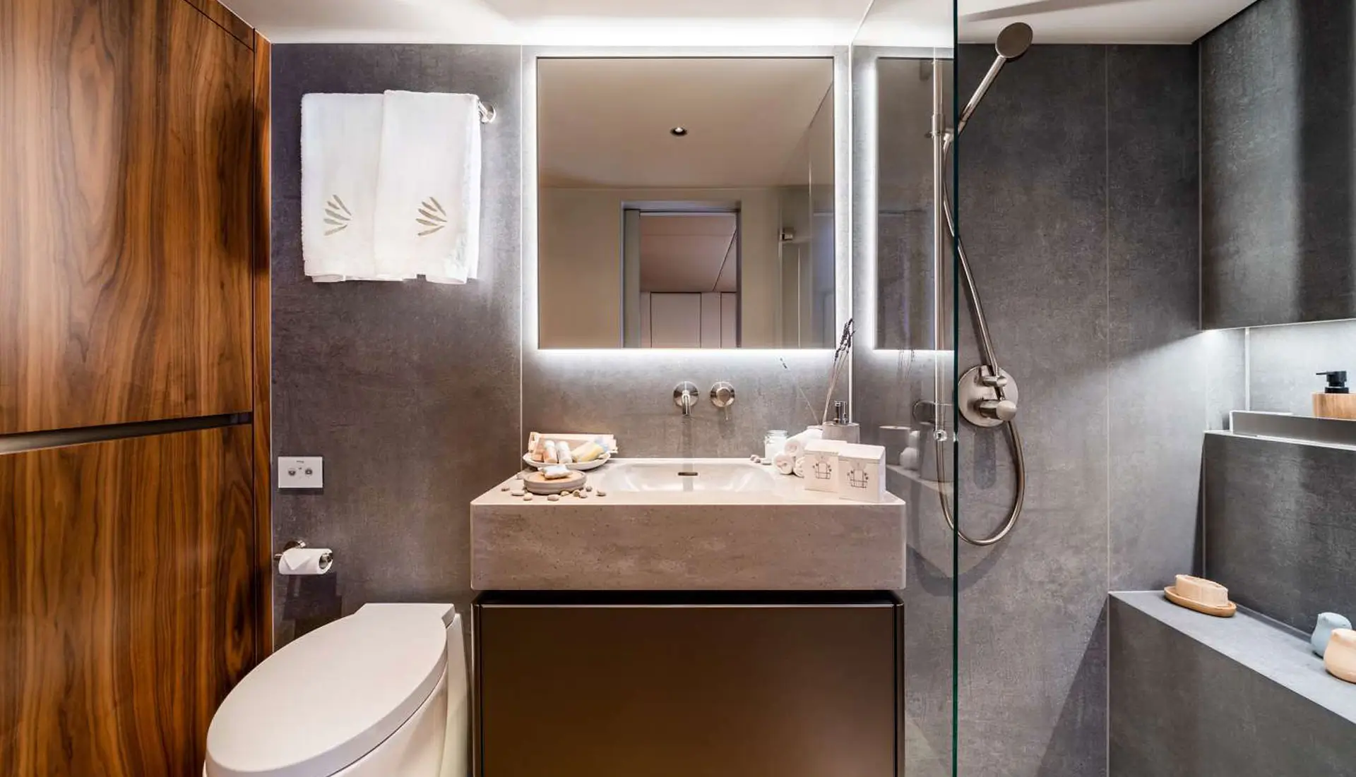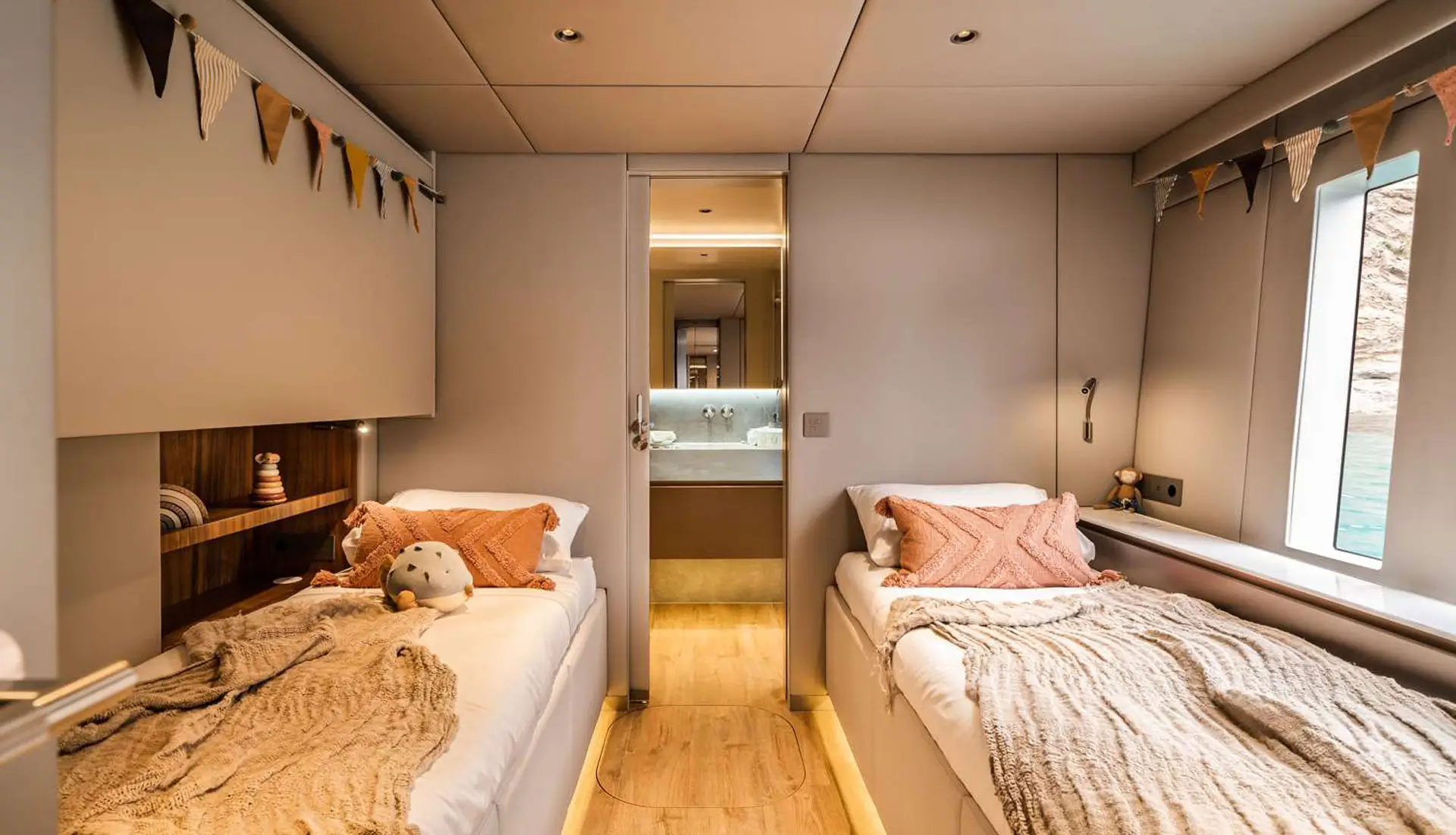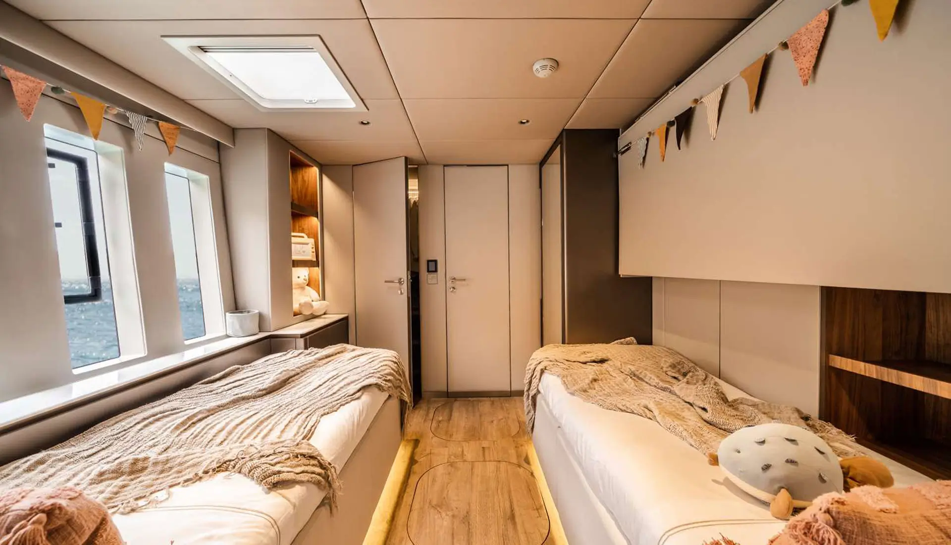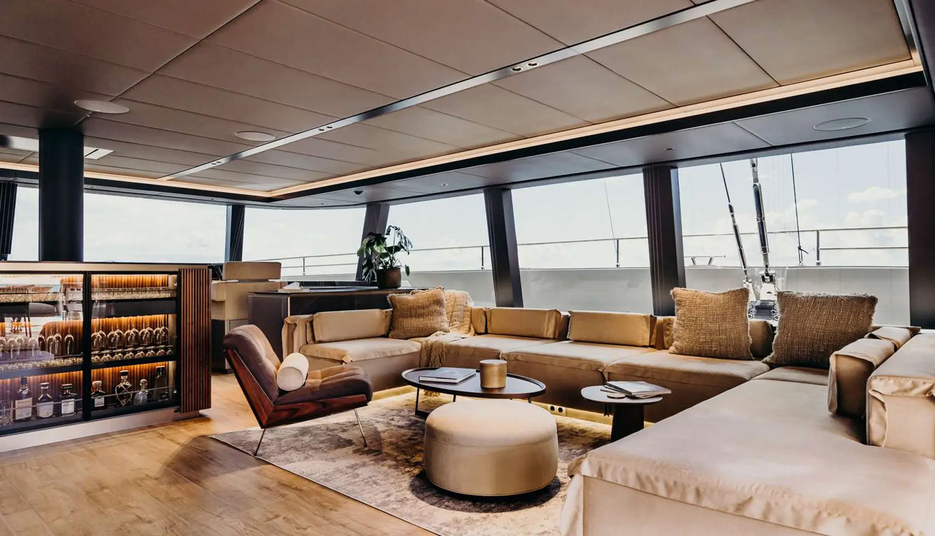 Her vast salon is a statement of elegance, fitted with bespoke décor, wooden flooring, and panoramic windows that admit natural light to stream through the space unimpeded. There are four well-appointed cabins, each with en-suite facilities, below deck, ideal for up to eight guests in double beds, with an additional guest in a Pullman berth. Outdoor living is at its finest, with multiple alfresco areas created for relaxation and entertainment.