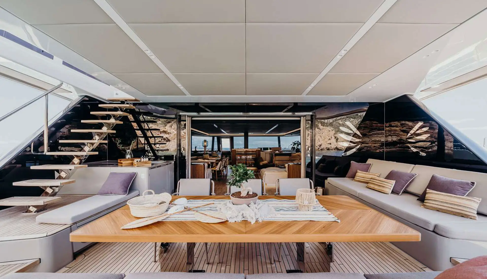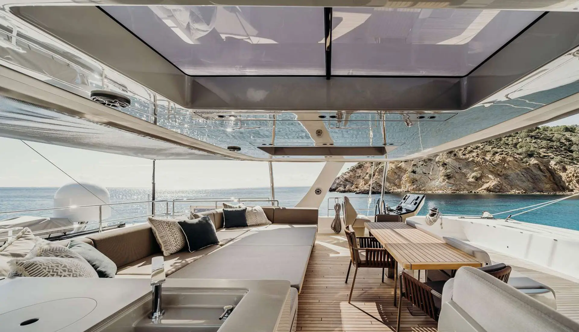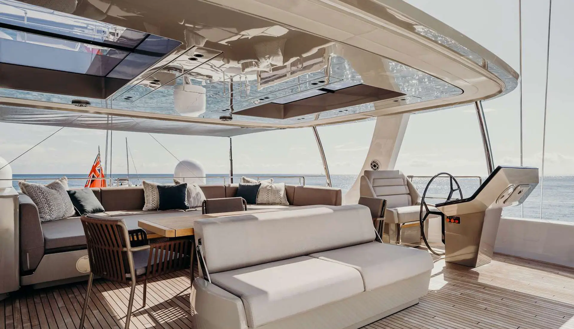 A wet bar, plush sun pads, and a spacious dining area are featured on the flybridge[...]